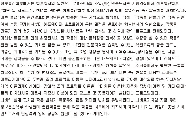 본문 시작 홈으로 SMIT 소식 SMIT 소개 SMIT 교육 SMIT 취업 SMIT 소식 SMIT 입학 홈페이지가이드 갤러리 공지사항 갤러리 경진대회 동아리 갤러리 페이스북 트위터 프린트 정보통신학부 졸업작품전 개최 오선진 6994 2012-10-04 일시 : 2012년 9월 18일 장소 : 제천 시민회관 2층 전시실 목록 이전2012학년도 졸업작품 중간발표회 개최 다음 2012년도 정보통신학부 연합 MT 담당부서 : 스마트IT학부 담당자 : - 연락처 : 043-649-1275 최종수정일 : 2024-10-26 만족도조사 만족도 조사 이 페이지에서 제공하는 정보에 대하여 만족하시나요? 매우만족 만족 보통 불만족 매우불만족
