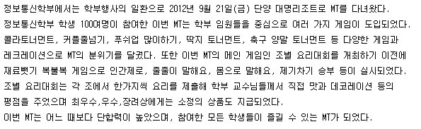본문 시작 홈으로 SMIT 소식 SMIT 소개 SMIT 교육 SMIT 취업 SMIT 소식 SMIT 입학 홈페이지가이드 갤러리 공지사항 갤러리 경진대회 동아리 갤러리 페이스북 트위터 프린트 기업체험과 ACE 프로그램 일환 KT 견학 오선진 7384 2012-11-04 일시 : 2012년 10월 26일(금) 09:30 -18:00대상 : 정보통신학부 3,4학년 (70명)인솔 : 오선진 학부장, 이성재 교수출발장소 : 전산정보학관 앞 목록 이전2012년도 정보통신학부 연합 MT 다음 미드필더인증제 봉사활동 실시 담당부서 : 스마트IT학부 담당자 : - 연락처 : 043-649-1275 최종수정일 : 2024-10-26 만족도조사 만족도 조사 이 페이지에서 제공하는 정보에 대하여 만족하시나요? 매우만족 만족 보통 불만족 매우불만족