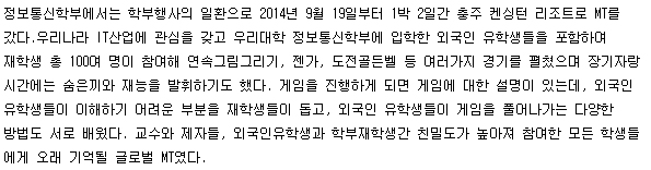 본문 시작 홈으로 SMIT 소식 SMIT 소개 SMIT 교육 SMIT 취업 SMIT 소식 SMIT 입학 홈페이지가이드 갤러리 공지사항 갤러리 경진대회 동아리 갤러리 페이스북 트위터 프린트 정보통신학부 졸업작품 전시회 및 학부 특성화 사업 설명회 개최 오선진 8065 2014-10-07 정보통신학부 졸업작품 전시회 및 학부 특성화 사업 설명회 개최 목록 이전정보통신학부, 글로벌 MT 개최 다음 한방·의료 ICT 융합 인재 양성 사업단, 오송 국제 바이오 엑스포 견학 담당부서 : 스마트IT학부 담당자 : - 연락처 : 043-649-1275 최종수정일 : 2024-10-26 만족도조사 만족도 조사 이 페이지에서 제공하는 정보에 대하여 만족하시나요? 매우만족 만족 보통 불만족 매우불만족