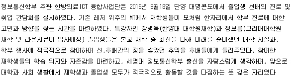 본문 시작 홈으로 SMIT 소식 SMIT 소개 SMIT 교육 SMIT 취업 SMIT 소식 SMIT 입학 홈페이지가이드 갤러리 공지사항 갤러리 경진대회 동아리 갤러리 페이스북 트위터 프린트 정보통신학부, "글로벌 정통 MT" 개최 관리자 6379 2015-09-30 정보통신학부, "글로벌 정통 MT" 개최 목록 이전한방-의료ICT 융합사업단, 졸업생 진로 및 취업간담회 실시 다음 한방-의료ICT 융합사업단, 캡스톤 디자인 경진대회 실시 담당부서 : 스마트IT학부 담당자 : - 연락처 : 043-649-1275 최종수정일 : 2024-10-26 만족도조사 만족도 조사 이 페이지에서 제공하는 정보에 대하여 만족하시나요? 매우만족 만족 보통 불만족 매우불만족