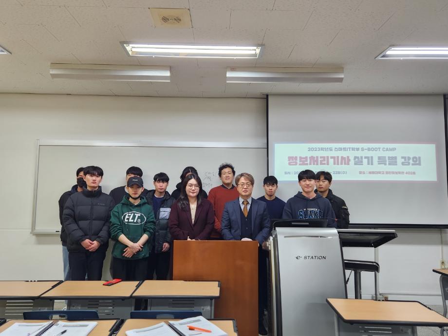 본문 시작 홈으로 SMIT 소식 SMIT 소개 SMIT 교육 SMIT 취업 SMIT 소식 SMIT 입학 홈페이지가이드 갤러리 공지사항 갤러리 경진대회 동아리 갤러리 페이스북 트위터 프린트 S-Boot Camp 정보처리기사 실기 특강 스마트IT학부 3830 2023-11-29 스마트IT학부는 4학년 재학생들을 대상으로 첨단정보학관 402호에서 2023.11.01(수), 08(수), 15(수), 22(수) 총 4주 동안 S-Boot Camp 정보처리기사 실기 특강을 시행했습니다. S-Boot Camp 정보처리기 실기 특강으로 학생들의 직무 역량을 강화할 수 있는 유익한 시간이었습니다. 목록 이전📌 잊지 말고! 수시 최초합격자 등록하자!! 다음 📌 2024학년도 세명대 정시 모집요강 안내 📌 담당부서 : 스마트IT학부 담당자 : - 연락처 : 043-649-1275 최종수정일 : 2024-10-26 만족도조사 만족도 조사 이 페이지에서 제공하는 정보에 대하여 만족하시나요? 매우만족 만족 보통 불만족 매우불만족
