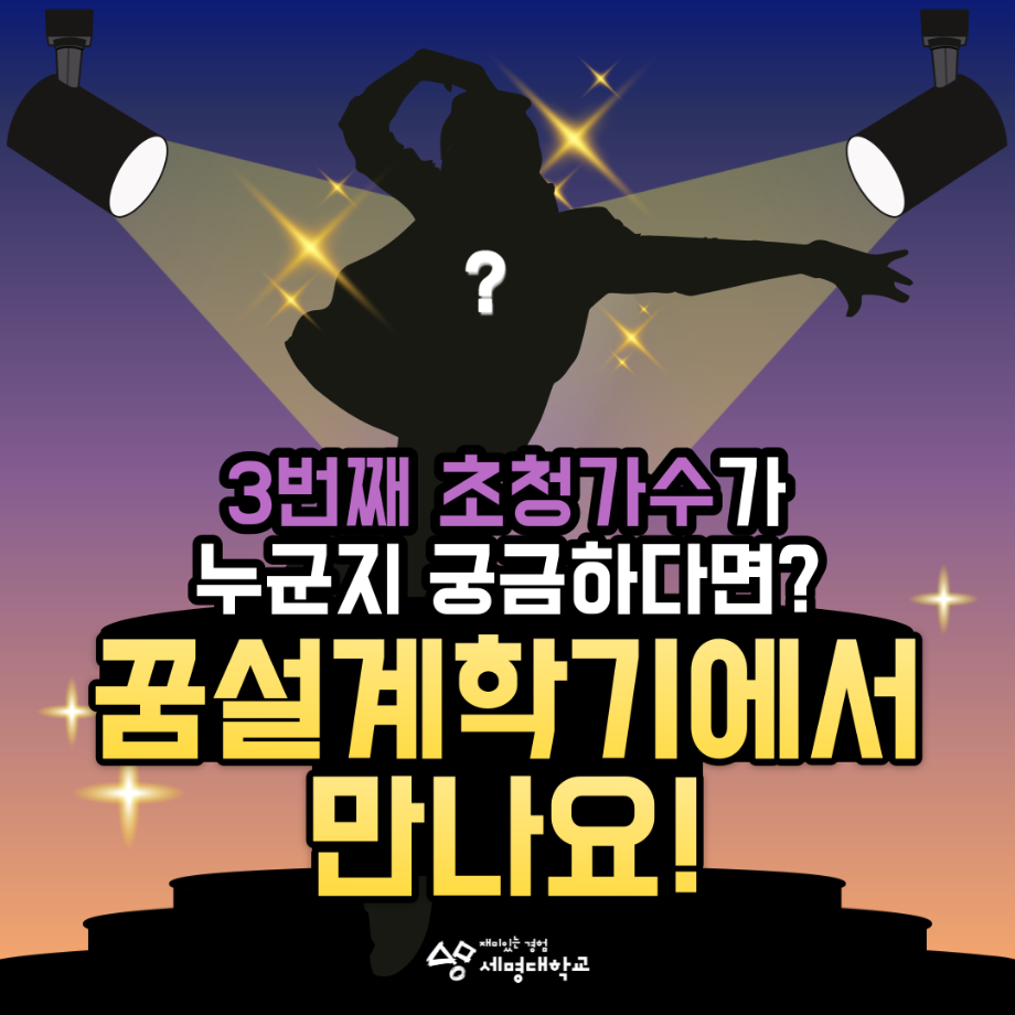 본문 시작 홈으로 SMIT 소식 SMIT 소개 SMIT 교육 SMIT 취업 SMIT 소식 SMIT 입학 홈페이지가이드 갤러리 공지사항 갤러리 경진대회 동아리 갤러리 페이스북 트위터 프린트 2024학년도 꿈설계학기 라인업 ✨ 스마트IT학부 2983 2024-02-01 세명대 2024 신입생 꿈설계학기(OT) 초청가수 라인업이 유출됐다?! 세명대학교의 2월에 절대 빠질 수 없는 행사, ✨꿈설계학기!✨ 2024 꿈설계학기 초청가수 라인업이 유출되었다는데...?!😮 🎵 첫번째 가수 힌트! 나에게만~ 준비된 OO같아~ 🎵 두번째 가수 힌트! 쇼미더머니 출신 여성 래퍼! 🎵 그리고 세번째 가수는 과연 누구일까요?🤔 세 번째 가수가 궁금하다면? 2월 19일! 꿈설계학기에서 만나요😎 목록 이전세명대학교 2024학년도 정시 합격자 발표 및 등록 일정 총정리💡 다음 스마트IT학부 전기 학위수여식 진행 ! 담당부서 : 스마트IT학부 담당자 : - 연락처 : 043-649-1275 최종수정일 : 2024-10-26 만족도조사 만족도 조사 이 페이지에서 제공하는 정보에 대하여 만족하시나요? 매우만족 만족 보통 불만족 매우불만족