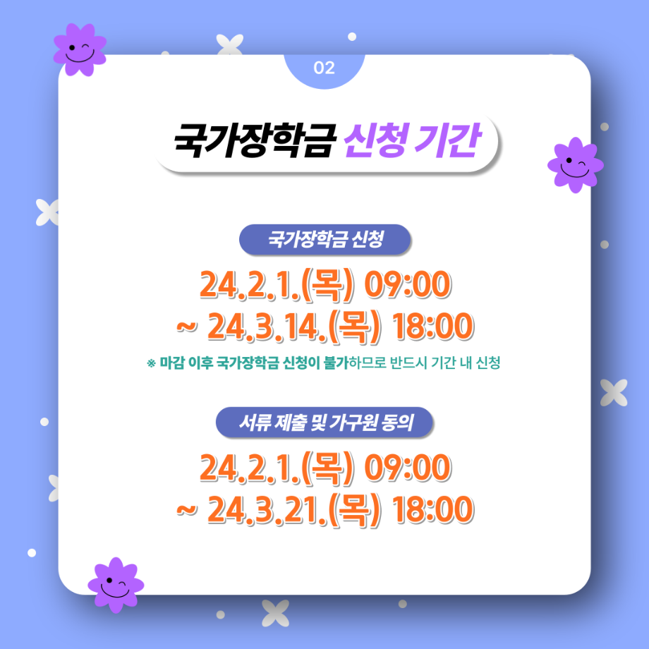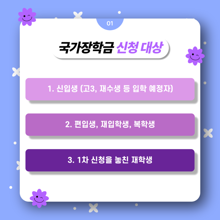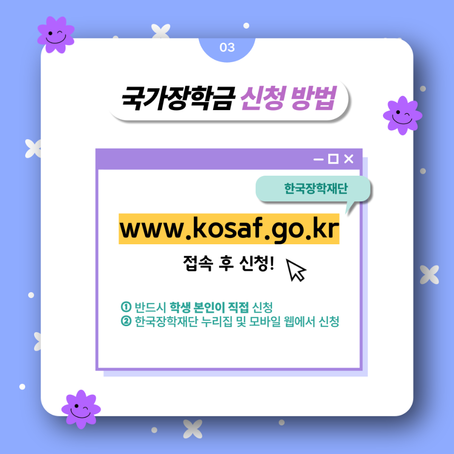 본문 시작 홈으로 SMIT 소식 SMIT 소개 SMIT 교육 SMIT 취업 SMIT 소식 SMIT 입학 홈페이지가이드 갤러리 공지사항 갤러리 경진대회 동아리 갤러리 페이스북 트위터 프린트 여러분! 국가장학금 2차 신청하세요! 스마트IT학부 2725 2024-02-23 여러분! 국가장학금 2차 신청하세요! ✔ 내가 세명대학교 신입생이라면! ✔ 내가 편입생, 재입학생, 복학생이라면! ✔ 내가 1차 신청을 놓쳤다면! 📌 24년 2월 1일(목) 09:00부터 3월 24일(목) 18:00까지 ✨ 한국장학재단 사이트에서 신청하세요! 목록 이전2024년도 꿈설계학기 2일차 다음 2024학년도 추가모집 주요사항 담당부서 : 스마트IT학부 담당자 : - 연락처 : 043-649-1275 최종수정일 : 2024-10-26 만족도조사 만족도 조사 이 페이지에서 제공하는 정보에 대하여 만족하시나요? 매우만족 만족 보통 불만족 매우불만족