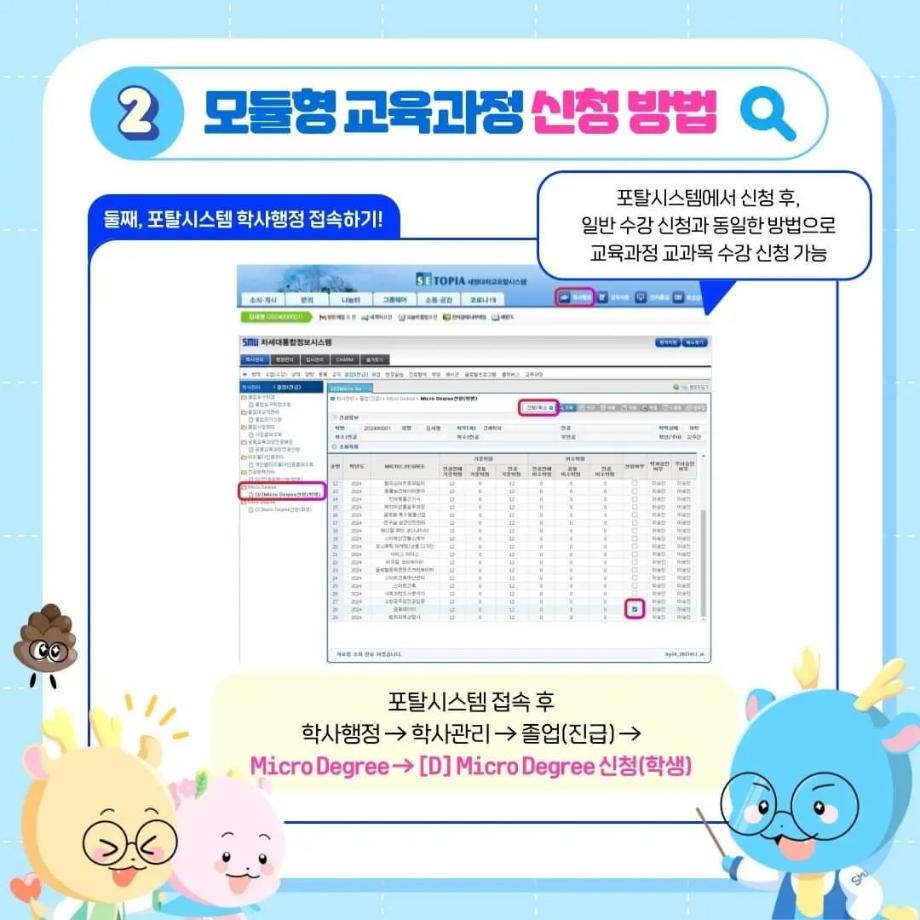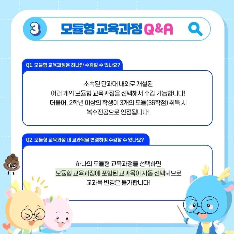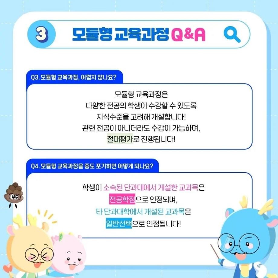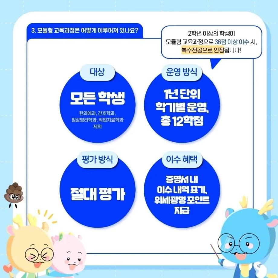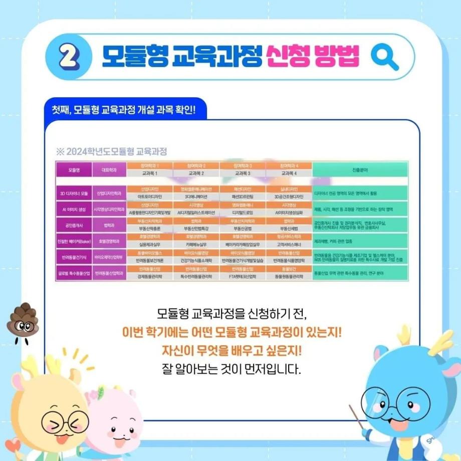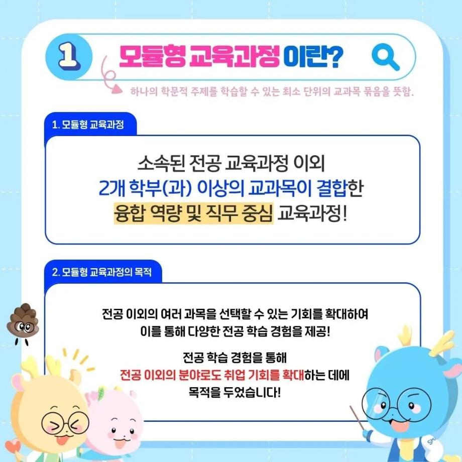 본문 시작 홈으로 SMIT 소식 SMIT 소개 SMIT 교육 SMIT 취업 SMIT 소식 SMIT 입학 홈페이지가이드 갤러리 공지사항 갤러리 경진대회 동아리 갤러리 페이스북 트위터 프린트 ✨모듈형 교육과정✨ 안내 스마트IT학부 2722 2024-03-29 융합인재를 위한 세명대의 새로운 시도, ✨모듈형 교육과정✨ 안내 2024년부터 시행되는 모듈형 교육과정! 2개 학부(과) 이상의 교과목이 결합한 ✔융합 역량 및 직무 중심 교육과정✔으로, 다양한 전공 학습 경험 제공을 통해 전공 이외의 분야로 ✨취업 기회를 확대✨할 수 있습니다! 모듈형 교육과정이 더 궁금하다면? 📞 043) 649-1131, 1135 (세명대학교 교무연구처 학사관리팀) 목록 이전2024학년도 신입생 환영회😀 다음 제천시 전입 장학금 안내 ! 담당부서 : 스마트IT학부 담당자 : - 연락처 : 043-649-1275 최종수정일 : 2024-10-26 만족도조사 만족도 조사 이 페이지에서 제공하는 정보에 대하여 만족하시나요? 매우만족 만족 보통 불만족 매우불만족