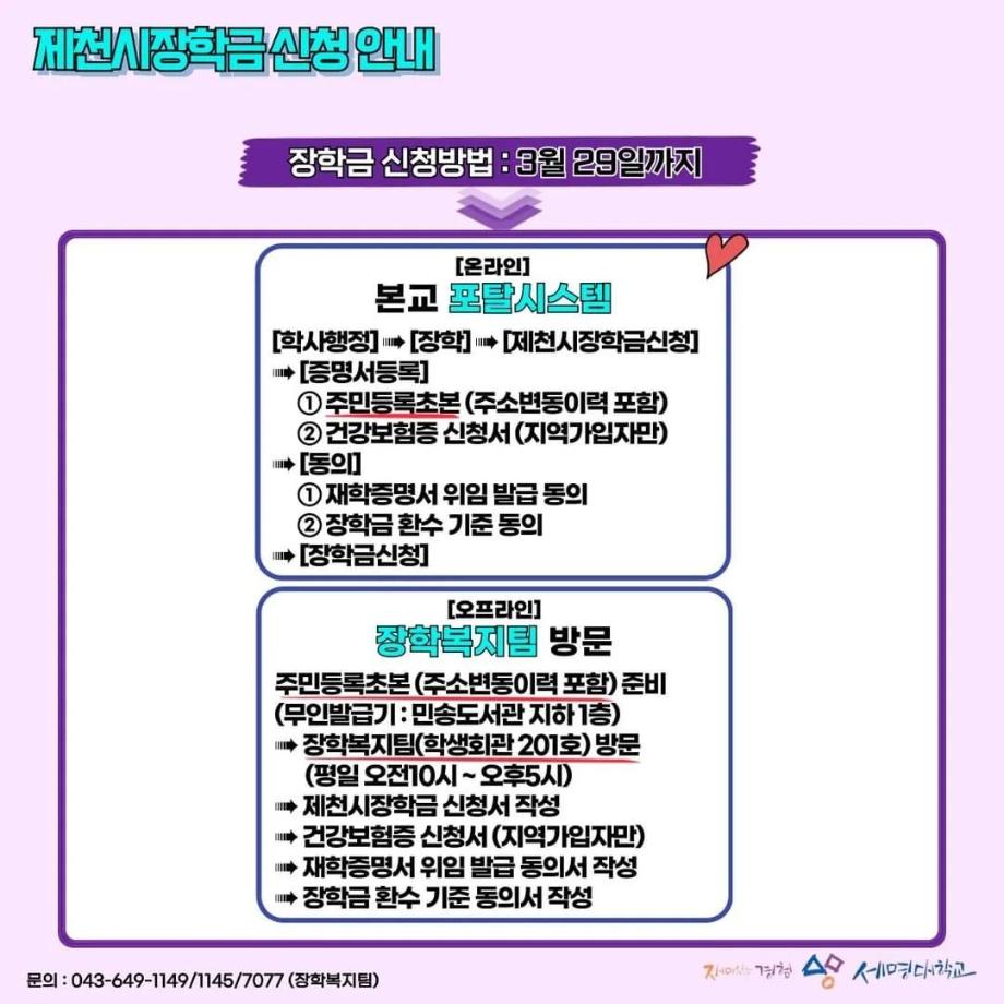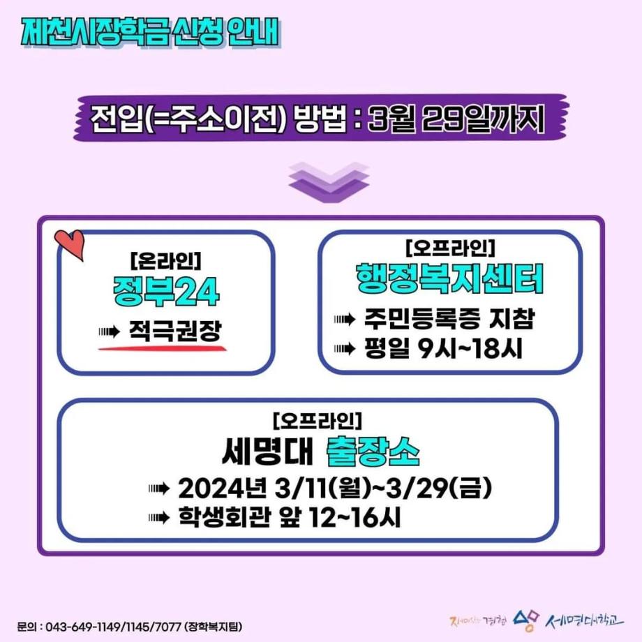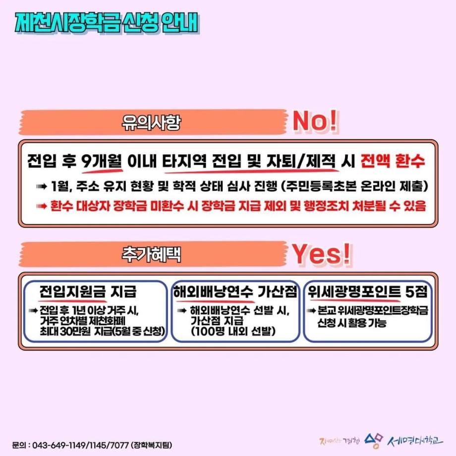 본문 시작 홈으로 SMIT 소식 SMIT 소개 SMIT 교육 SMIT 취업 SMIT 소식 SMIT 입학 홈페이지가이드 갤러리 공지사항 갤러리 경진대회 동아리 갤러리 페이스북 트위터 프린트 제천시 전입 장학금 안내 ! 스마트IT학부 2641 2024-03-29 ⏲ 신청기간 : 3월 29일(금) 까지 제천시로 전입하면 100만원을 드려요~ 목록 이전✨모듈형 교육과정✨ 안내 다음 엉뚱한 연구활동 프로그램 시행안내! 담당부서 : 스마트IT학부 담당자 : - 연락처 : 043-649-1275 최종수정일 : 2024-10-26 만족도조사 만족도 조사 이 페이지에서 제공하는 정보에 대하여 만족하시나요? 매우만족 만족 보통 불만족 매우불만족