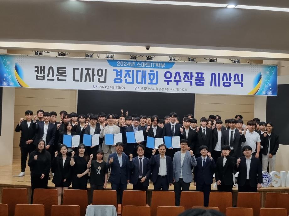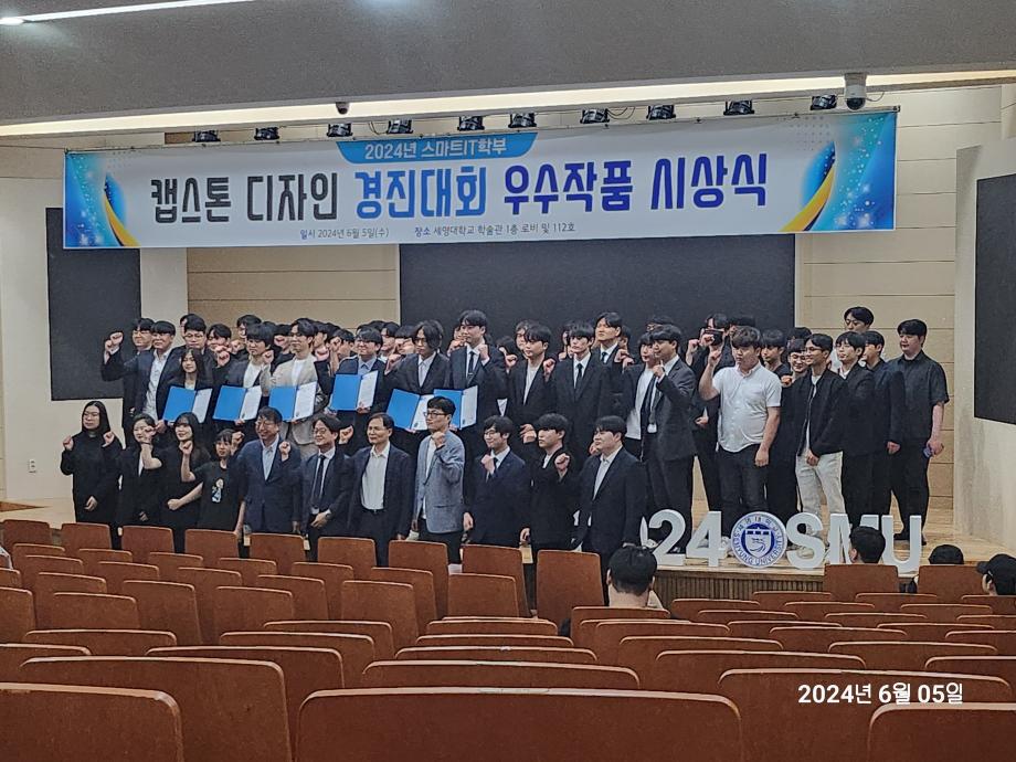 본문 시작 홈으로 SMIT 소식 SMIT 소개 SMIT 교육 SMIT 취업 SMIT 소식 SMIT 입학 홈페이지가이드 갤러리 공지사항 갤러리 경진대회 동아리 갤러리 페이스북 트위터 프린트 2024학년도 졸업작품 전시회 개최 스마트IT학부 2829 2024-06-07 안녕하세요 세명대학교 스마트IT학부입니다🙂 2024년 6월 5일에 스마트IT학부 캡스톤 디자인 경진대회를 진행하였습니다! 이번 발표회와 시상식이 더 넓은 세계로 나아가기 위한 발딛음이 되었으면 하는 바람으로 4학년 분들, 긴 시간동안 정말 고생 많으셨습니다😊 캡스톤 디자인 경진대회 진행을 도와주신 교수님들께도 감사인사 전합니다. #제천 #세명대 #세명대학교 #IT #캡스톤 #디자인 #발표회 #시상식 #졸업작품 목록 이전제천제일고 전공체험활동!! 다음 세명대학교 꿈 실현 장학금 신청 안내 담당부서 : 스마트IT학부 담당자 : - 연락처 : 043-649-1275 최종수정일 : 2024-10-26 만족도조사 만족도 조사 이 페이지에서 제공하는 정보에 대하여 만족하시나요? 매우만족 만족 보통 불만족 매우불만족