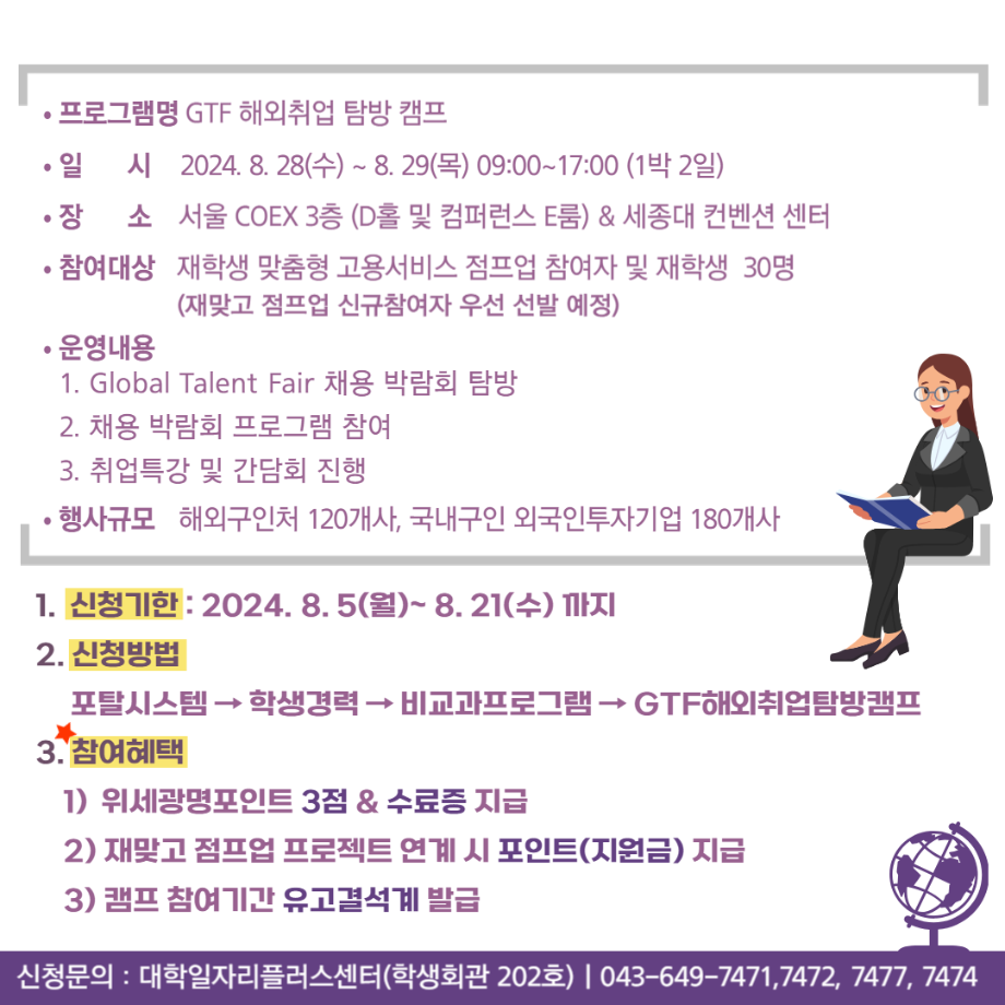 본문 시작 홈으로 SMIT 소식 SMIT 소개 SMIT 교육 SMIT 취업 SMIT 소식 SMIT 입학 홈페이지가이드 갤러리 공지사항 갤러리 경진대회 동아리 갤러리 페이스북 트위터 프린트 📢 GTF해외취업탐방&캠프 안내 스마트IT학부 2331 2024-08-05 (확성기)안녕하세요, 대학일자리플러스센터 재맞고팀 입니다. 현재, 8/28(수)~29(목)에 진행되는 'GTF해외취업탐방&캠프' 신청자 모집 중에 있습니다. 본 프로그램은 1박 2일로 진행되며, 위세광명포인트 지급 및 유고결석계가 발급됩니다. 또한, 재학생맞춤형고용서비스 점프업 프로젝트 연계 시 프로그램 종료 후 지원금(20만원) 지급 예정입니다. 많은 관심과 참여 부탁드립니다!! 목록 이전★2024학년도 2학기 팝업스토어 신청자 모집★ 다음 [보도자료] 세명대학교 스마트IT학부 "드론코더 300 프로젝트 방학프로그램" 담당부서 : 스마트IT학부 담당자 : - 연락처 : 043-649-1275 최종수정일 : 2024-10-26 만족도조사 만족도 조사 이 페이지에서 제공하는 정보에 대하여 만족하시나요? 매우만족 만족 보통 불만족 매우불만족