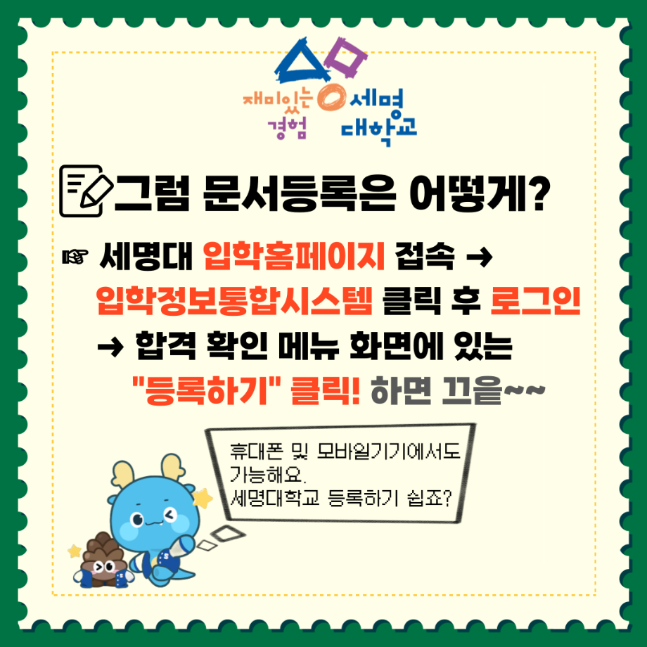 본문 시작 홈으로 SMIT 소식 SMIT 소개 SMIT 교육 SMIT 취업 SMIT 소식 SMIT 입학 홈페이지가이드 갤러리 공지사항 갤러리 경진대회 동아리 갤러리 페이스북 트위터 프린트 2025학년도 수시모집 충원합격자 발표/등록 안내 스마트IT학부 2157 2024-12-19 2025학년도 수시모집 충원합격자 발표/등록 안내 자세한 내용은 세명대학교 입학홈페이지 참고 (https://ipsi.semyung.ac.kr/) 목록 이전수시모집 최초 합격자 발표 안내 다음 📌 2025 학년도 정시모집 안내 📌 담당부서 : 스마트IT학부 담당자 : - 연락처 : 043-649-1275 최종수정일 : 2024-10-26 만족도조사 만족도 조사 이 페이지에서 제공하는 정보에 대하여 만족하시나요? 매우만족 만족 보통 불만족 매우불만족