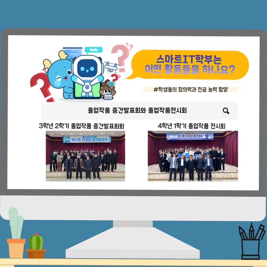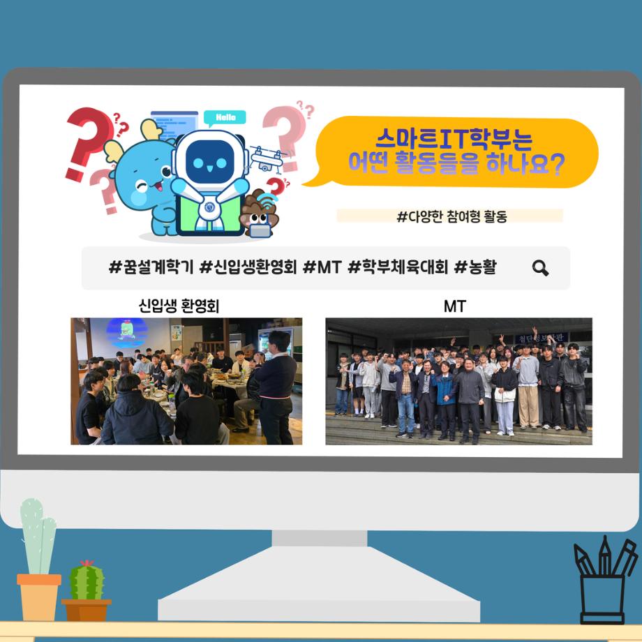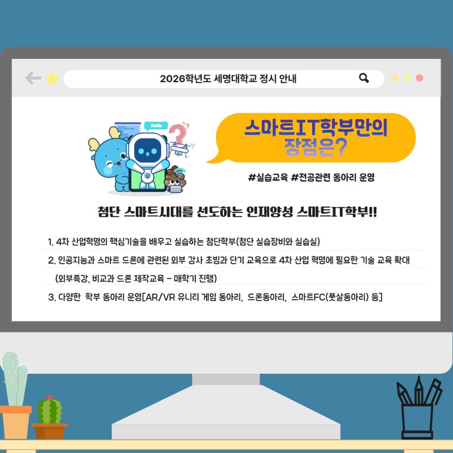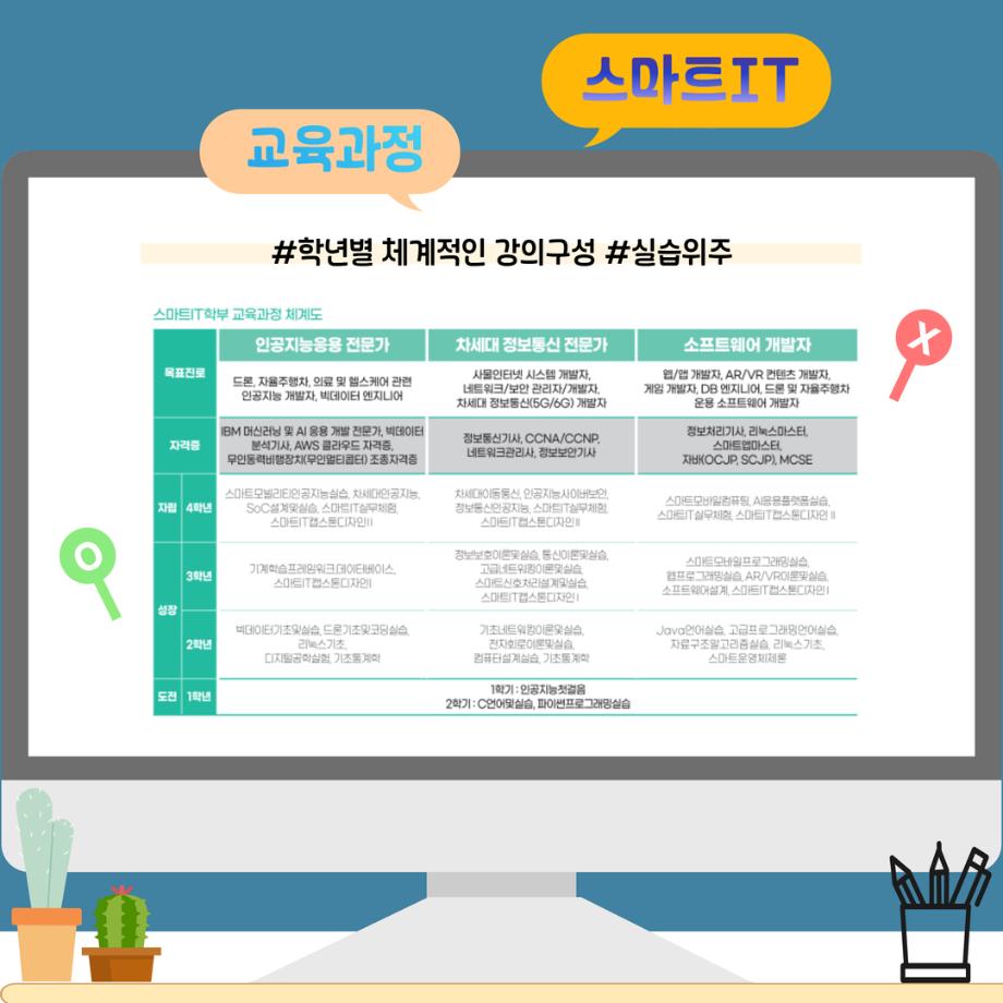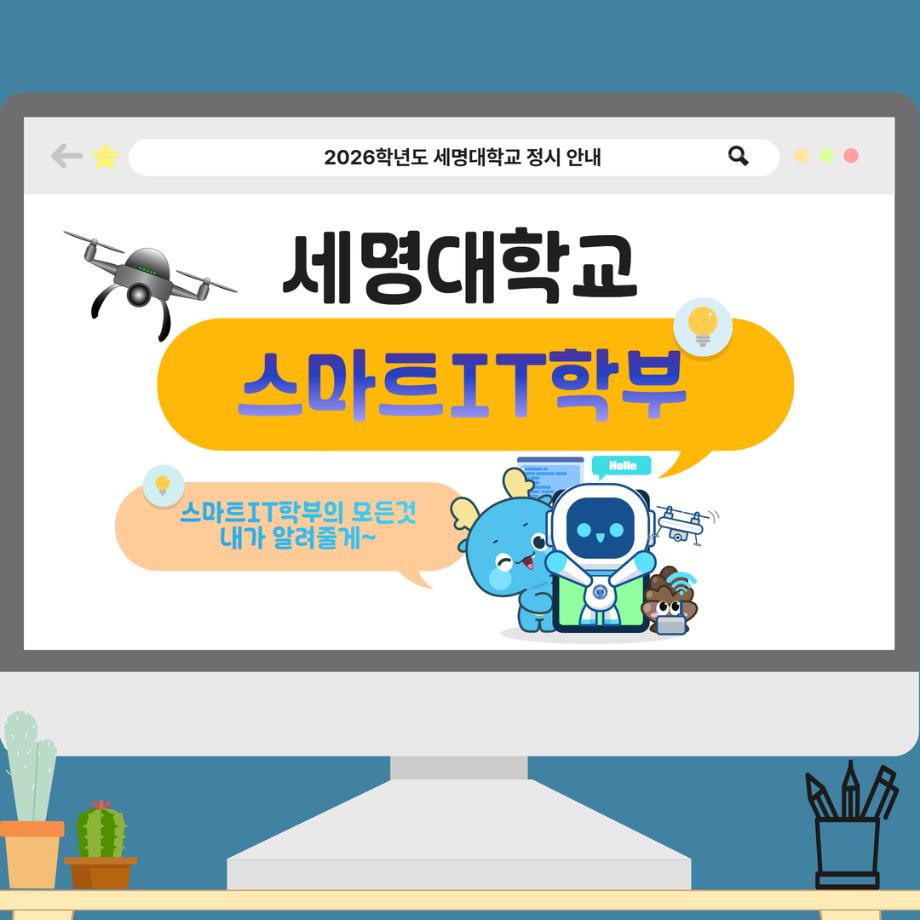 본문 시작 홈으로 SMIT 소식 SMIT 소개 SMIT 교육 SMIT 취업 SMIT 소식 SMIT 입학 홈페이지가이드 갤러리 공지사항 갤러리 경진대회 동아리 갤러리 페이스북 트위터 프린트 📢2026 정시모집 + 스마트IT학부의 각종활동📢 스마트IT학부 885 2025-12-30 📢2026 정시모집 + 스마트IT학부의 각종활동📢 목록 이전2026 정시모집 안내 다음 (축) 신규 임용 신용제 교수 담당부서 : 스마트IT학부 담당자 : - 연락처 : 043-649-1275 최종수정일 : 2024-10-26 만족도조사 만족도 조사 이 페이지에서 제공하는 정보에 대하여 만족하시나요? 매우만족 만족 보통 불만족 매우불만족
