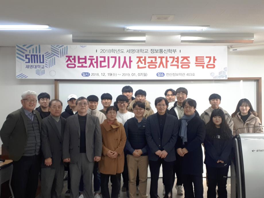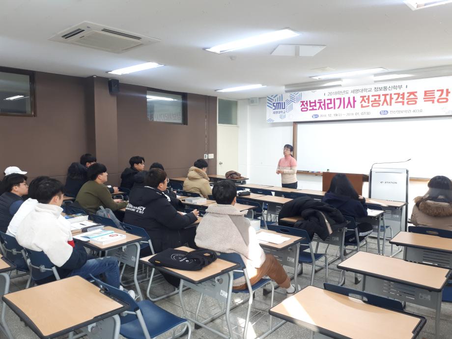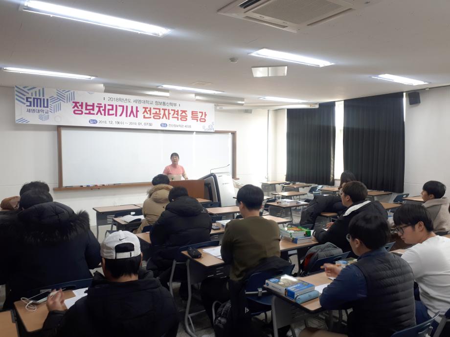 본문 시작 홈으로 SMIT 소식 SMIT 소개 SMIT 교육 SMIT 취업 SMIT 소식 SMIT 입학 홈페이지가이드 갤러리 공지사항 갤러리 경진대회 동아리 갤러리 페이스북 트위터 프린트 2018학년도 동계방학 중 정보처리기사 자격증 특강 진행 정보통신학부 6669 2018-12-28 정보통신학부에서는 방학기간 정보처리기사 전공자격증 특강을 2018년 12월 19일(수) ~ 2019년 01월 07일(월)까지 전산정보학관 403호에서 진행된다. 특강에 참여하는 학생들은 데이터베이스, 데이터통신, 운영체제, 소프트웨어공학, 전자계산기구조 5과목을 10일 동안 4시간씩 배우게 된다. 참여 학생들은 전공자격증 특강을 통해 자격증을 보다 쉽게 취득할 수 있도록 도와주는 계기가 될 것이며 전공자격증 취득을 기대해본다. 목록 이전2018학년도 캡스톤디자인경진대회(졸업작품전시회) 중간발표회 다음 2018학년도 전기 학위수여식 담당부서 : 스마트IT학부 담당자 : - 연락처 : 043-649-1275 최종수정일 : 2024-10-26 만족도조사 만족도 조사 이 페이지에서 제공하는 정보에 대하여 만족하시나요? 매우만족 만족 보통 불만족 매우불만족