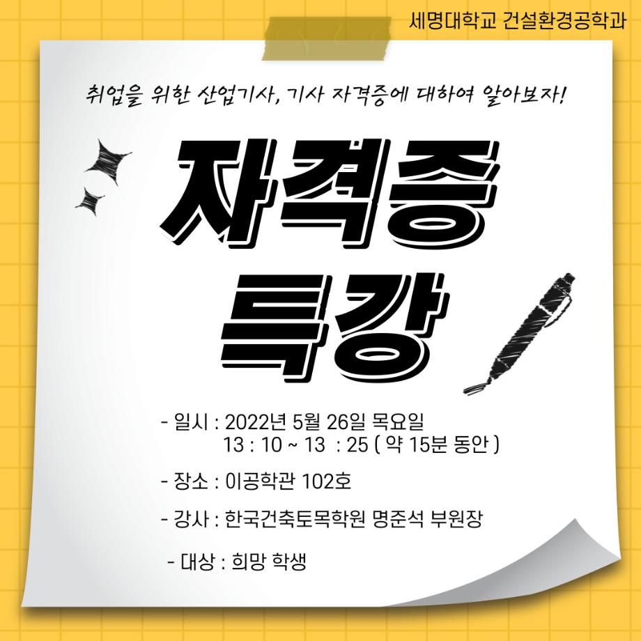 명준석 부원장님은 전공 자격증에 관심이 있는 세명대학교 건설환경공학과 재학생들에게 취업에 필요한 산업기사 및 기사 자격증에 대한 설명과 시험교과목 6과목에 대한 내용, 필기/실기 시험 일정, 학원에서 진행되는 커리큘럼 등을 자세하게 설명해주셨습니다. 이번 자격증 특강으로 자격증 준비에 관심이 있는 학생들과 혼자 자격증 공부를 학생들에게 많은 도움이 되었습니다.