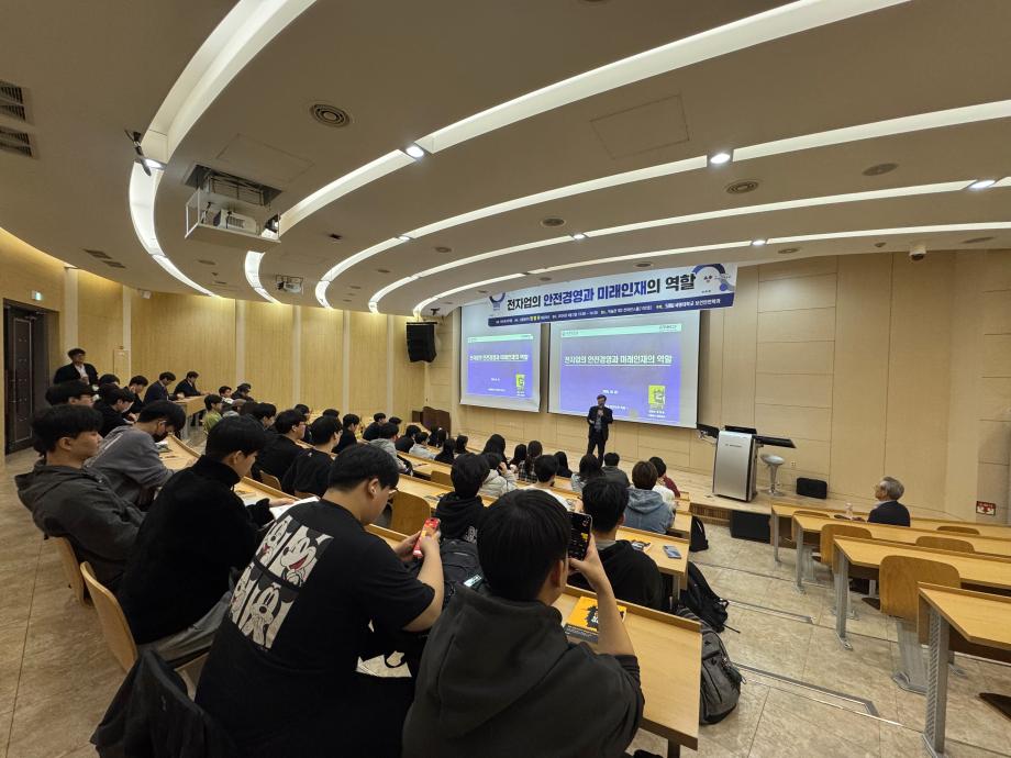 보건안전학과는 도레이그룹 계열의 전자·반도체 대기업인 스템코(주) 엄영하 대표이사님을 모시고 4월 2일(목) 학술관 제2 컨퍼런스홀 102호실에서 임원특강을 진행하였습니다. ‘전자업의 안전경영과 미래인재의 역할’이라는 주제로 전자산업 현장에서 재해와 중대 재해를 사전에 철저히 예방하기 위해 안전경영 중요성과 4차 산업시대에 요구되는 안전보건 인재의 역할과 산업현장의 안전은 더 이상 규제 대응이나 사후 관리의 영역이 아니라 기업의 지속가능성과 경쟁력을 좌우하는 핵심 요소임을 강조하였다.