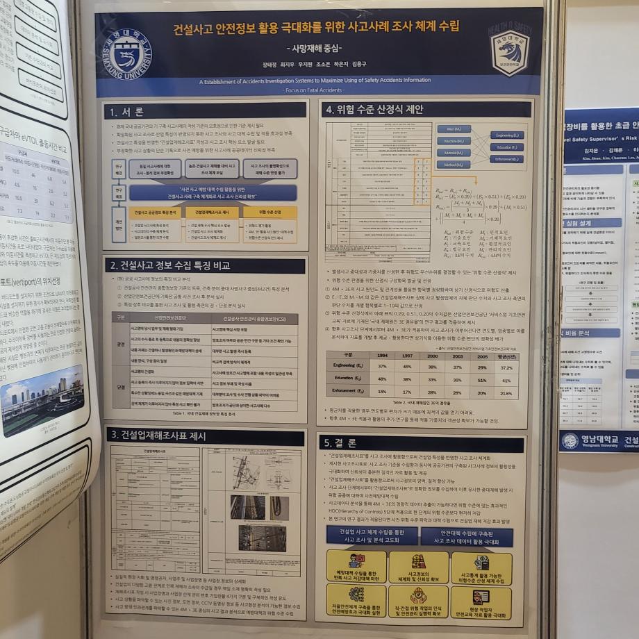 본문 시작 홈으로 커뮤니티 학과소개 진로 및 취업 교수소개 학과과정 커뮤니티 홈페이지가이드 포토갤러리 학과공지 학사일정 포토갤러리 학생회 학과영상 보건안전학과 인스타 보건안전학과 블로그 포토갤러리 페이스북 트위터 프린트 2023년 한국건설관리학회 주최 "정기학술발표대회"참가하여 장려상 수상 (학생 : 장태정(4학년), 최지우(4학년), 우지원(4학년), 조소은(4학년), 하은지(3학년) - 지도교수 : 김용구) 보건안전학과 3408 2023-11-10 2023년 한국건설관리학회 주최 "정기학술발표대회"에 참가 "전국 대학생 학술발표대회 부문에서"에서 장려상 수상 - 학회명 : 한국건설관리학회 - 일시 : 2023 11.3(금), 강원도 고성 소노캄 델피노 - 논문명 : 건설사고 안전정보 활용 극대화를 위한 사고사례 조사체계 수립(사망재해 중심) - 연구참여자 : 장태정(4학년), 최지우(4학년), 우지원(4학년), 조소은(4학년), 하은지(3학년) - 지도교수 : 김용구 목록 이전2023년도 (사)대한설비관리학회 제28회 학술발표대회 세명대 보건안전학과 최우수상(2등) 수상 다음 제4회 보건바이오대학 charm경험발표회 담당부서 : 보건안전학과 담당자 : - 연락처 : 043-649-1777 최종수정일 : 2024-10-26 만족도조사 만족도 조사 이 페이지에서 제공하는 정보에 대하여 만족하시나요? 매우만족 만족 보통 불만족 매우불만족