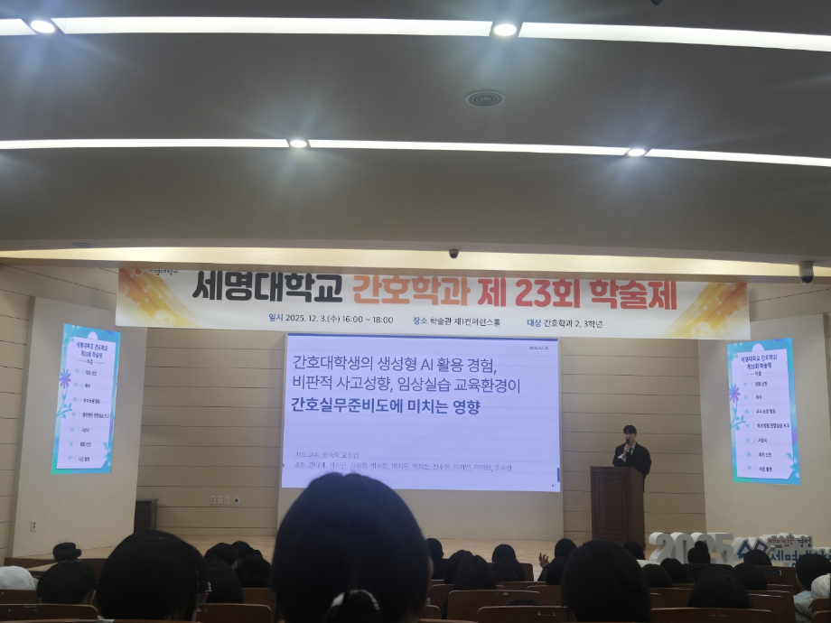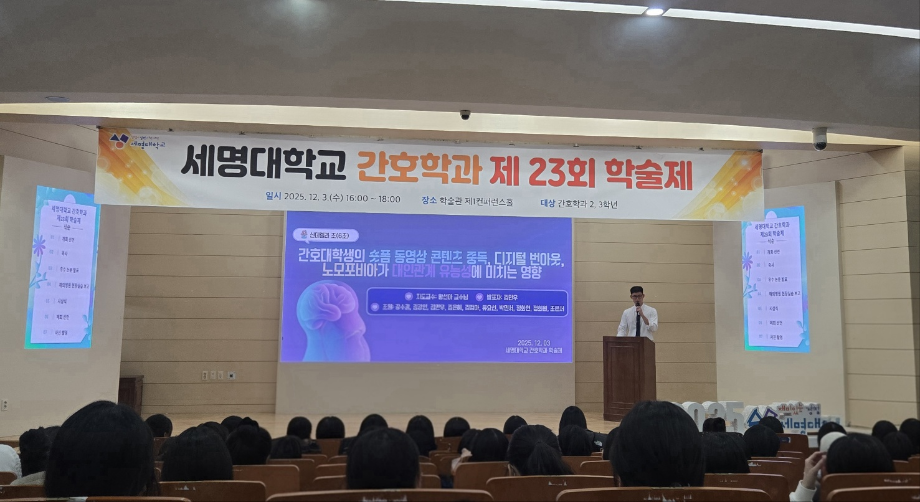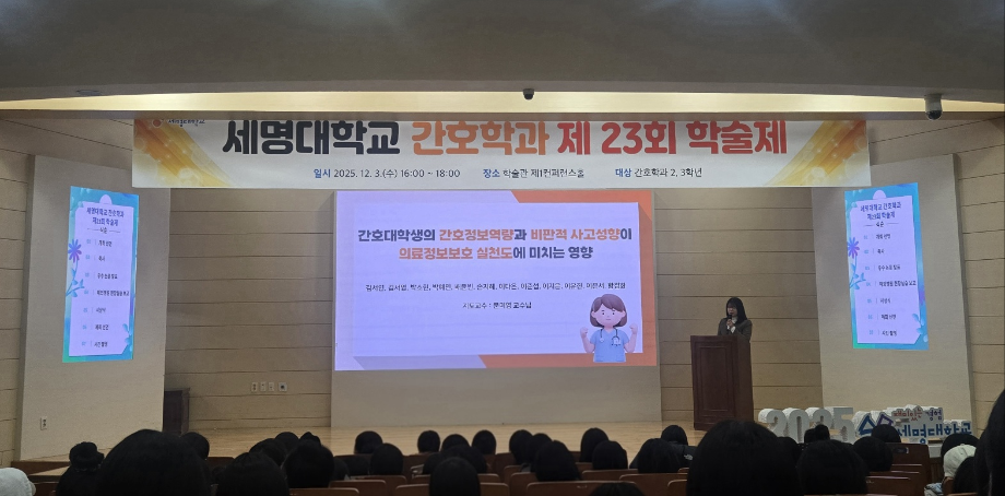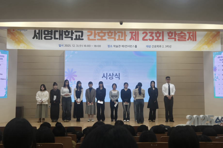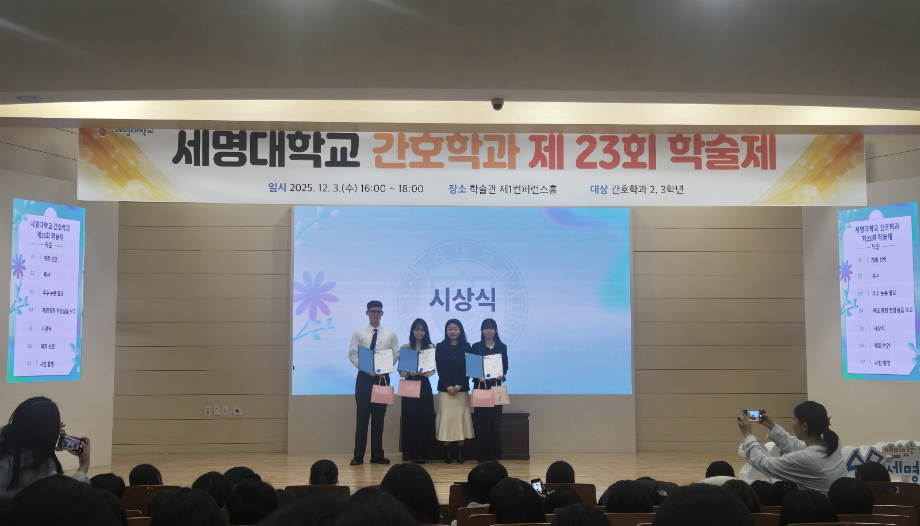 본문 시작 홈으로 커뮤니티 학과소개 교수소개 교육과정 학과소식 학과특성화 사업 커뮤니티 홈페이지가이드 포토갤러리 학사일정 포토갤러리 학생회 학과동아리 학과 취업정보 동창회 학과운영개선의견 발전기금 포토갤러리 페이스북 트위터 프린트 제 23회 간호학과 학술제 간호학과 2034 2025-12-08 12/3 진행된 📝 2024 학술제 발표와 ✈ 해외 인턴십 경험 공유 후기가 학과 블로그에 업로드되었습니다. 발표 현장과 생생한 경험담이 궁금하다면 아래 링크를 확인해주세요 👇 🔗 링크 https://blog.naver.com/nursing_smu_official/224099825798 목록 이전📍 ‘임상실습 안전사고 ZERO를 위하여’ 특강 다음 세명대학교 간호학과 제66회 간호사 국가시험 임장지도 실시 담당부서 : 간호학과 담당자 : - 연락처 : 043-649-1357 최종수정일 : 2024-10-26 만족도조사 만족도 조사 이 페이지에서 제공하는 정보에 대하여 만족하시나요? 매우만족 만족 보통 불만족 매우불만족