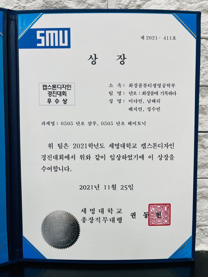 본문 시작 홈으로 커뮤니티 학과소개 학과과정 대학원 커뮤니티 연구동아리 홈페이지가이드 포토갤러리 학과공지 채용정보 학과일정 포토갤러리 유튜브 인스타그램 취업현황 학생회 조직도 졸업생 숏터뷰 포토갤러리 페이스북 트위터 프린트 2021학년도 캡스톤디자인 경진대회 입상_단오 팀 화장품뷰티학부 3619 2021-12-20 2021학년도 세명대학교 캡스톤디자인 경진대회에서 우리 화장품학부 '단오' 팀에서 우수상을 받았습니다. 입상 축하드립니다 :) 목록 이전2021 대학혁신지원사업 연구역량 강화 프로그램 포스터 게시 다음 세명대학교 화장품뷰티학부 2022학년도 정시모집 안내 담당부서 : 바이오코스메틱학과 담당자 : - 연락처 : 043-649-1638 최종수정일 : 2024-10-26 만족도조사 만족도 조사 이 페이지에서 제공하는 정보에 대하여 만족하시나요? 매우만족 만족 보통 불만족 매우불만족