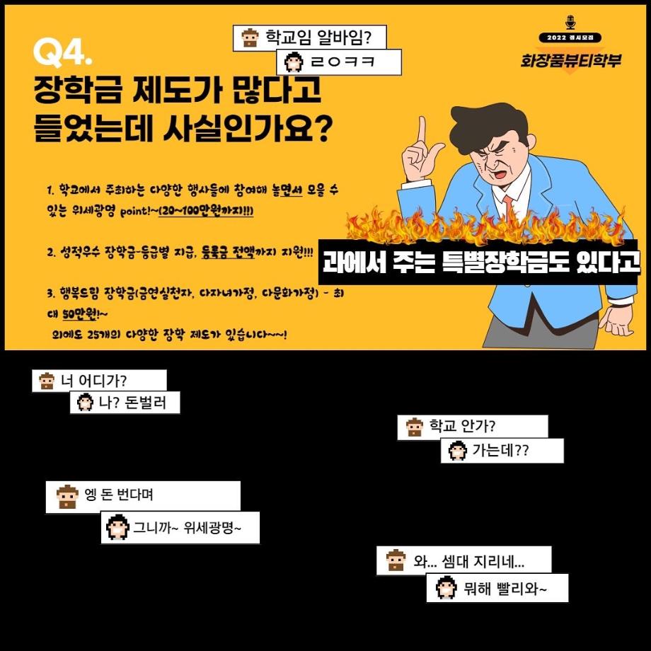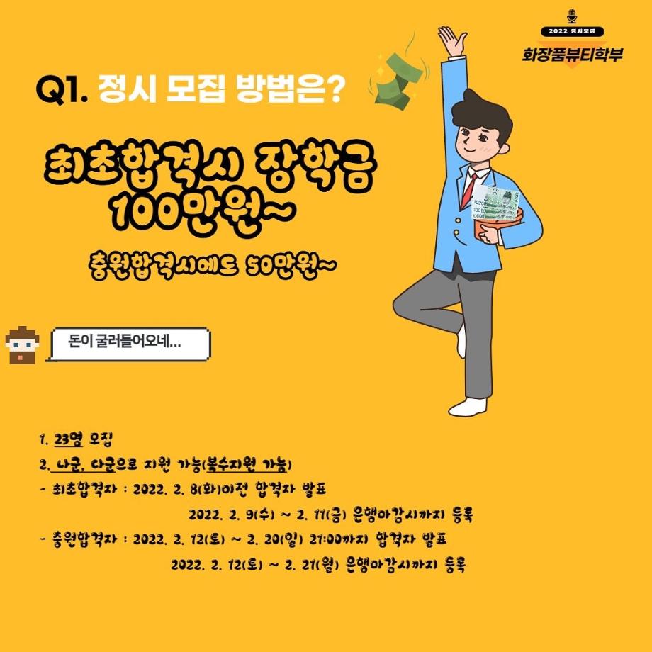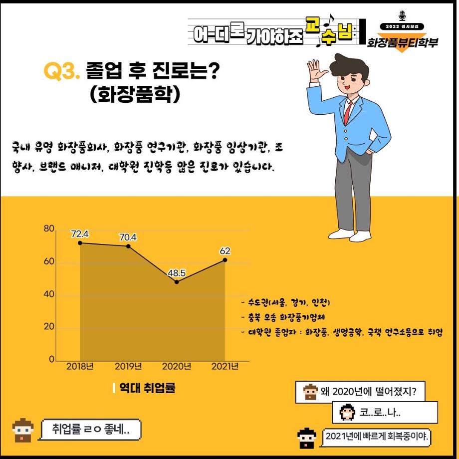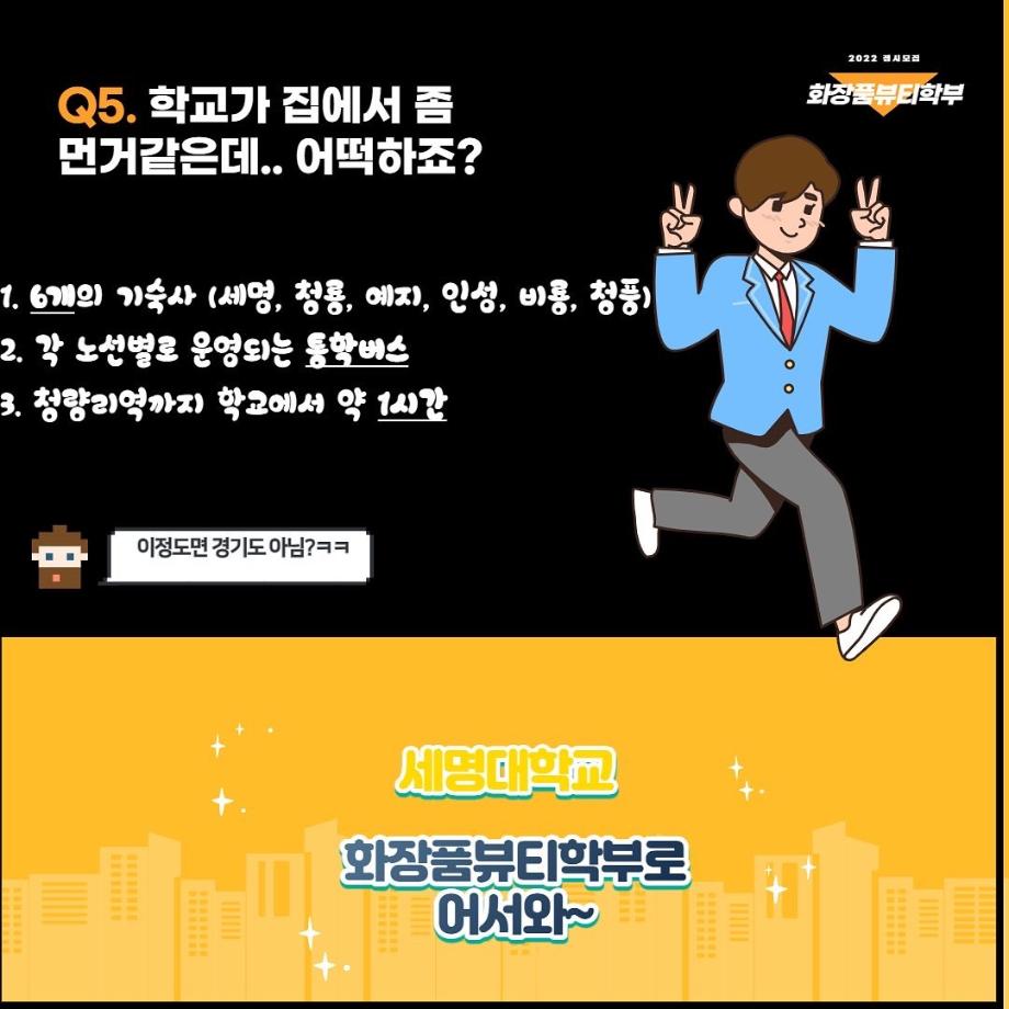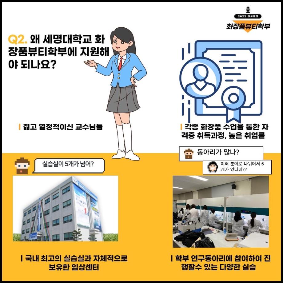 본문 시작 홈으로 커뮤니티 학과소개 학과과정 대학원 커뮤니티 연구동아리 홈페이지가이드 포토갤러리 학과공지 채용정보 학과일정 포토갤러리 유튜브 인스타그램 취업현황 학생회 조직도 졸업생 숏터뷰 포토갤러리 페이스북 트위터 프린트 세명대학교 화장품뷰티학부 2022학년도 정시모집 안내 화장품뷰티학부 3279 2022-01-13 그곳이 알고싶다! 세명대학교 화장품뷰티학부를 소개합니다~ 목록 이전2021학년도 캡스톤디자인 경진대회 입상_단오 팀 다음 2021학년도 화장품뷰티학부 공유대학 혁신인재장학금 장학생 명단 담당부서 : 바이오코스메틱학과 담당자 : - 연락처 : 043-649-1638 최종수정일 : 2024-10-26 만족도조사 만족도 조사 이 페이지에서 제공하는 정보에 대하여 만족하시나요? 매우만족 만족 보통 불만족 매우불만족