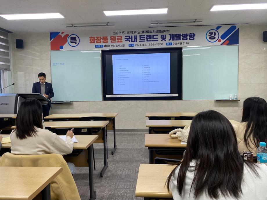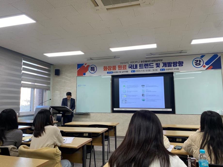 본문 시작 홈으로 커뮤니티 학과소개 학과과정 대학원 커뮤니티 연구동아리 홈페이지가이드 포토갤러리 학과공지 채용정보 학과일정 포토갤러리 유튜브 인스타그램 취업현황 학생회 조직도 졸업생 숏터뷰 포토갤러리 페이스북 트위터 프린트 2023학년도 화장품산업실무체험 제5회 특강 화장품뷰티학부 2768 2023-11-09 세상코스메틱(Dr.G) 박준우 R&D 본부장님께서 진행하신 <화장품 원료 국내 트렌드 및 개발방향> 에 대하여 강의해주셨습니다. 목록 이전2023학년도 2학기 화장품 산업 실무체험 제4회 전문가 초청 특강 다음 S-BOOT 2차 전문가 초빙 취업코칭 특강 담당부서 : 바이오코스메틱학과 담당자 : - 연락처 : 043-649-1638 최종수정일 : 2024-10-26 만족도조사 만족도 조사 이 페이지에서 제공하는 정보에 대하여 만족하시나요? 매우만족 만족 보통 불만족 매우불만족