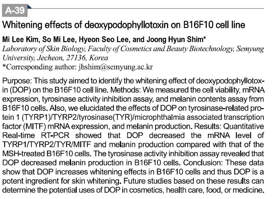 본문 시작 홈으로 커뮤니티 학과소개 학과과정 대학원 커뮤니티 연구동아리 홈페이지가이드 포토갤러리 학과공지 채용정보 학과일정 포토갤러리 유튜브 인스타그램 취업현황 학생회 조직도 졸업생 숏터뷰 포토갤러리 페이스북 트위터 프린트 학과내 동아리 '천만화소(천만가지 화장품소재)' 2020년 한국분자세포생물학회 참가 화장품뷰티생명공학부 6864 2020-10-08 학과내 천만화소 동아리는 10/5~7에 개최된 한국분자세포생물학회에서 'B16F10 세포에서 DOP에 의한 미백효과'라는 제목으로 포스터 발표를 했다. 화장품뷰티생명공학부 김미리, 이소미, 이현서 학생은 세포배양 및 세포생존률 평가, 유전자발현 확인을 통해 신규 미백 기능성 소재를 발굴하여 학계에 보고하는 성과를 달성하였다. 목록 이전2020학년도 "아쿠아디테" 하계 방학 중 특별활동 다음 화장품뷰티생명공학부 1학년 대상 프로그램 실시 담당부서 : 바이오코스메틱학과 담당자 : - 연락처 : 043-649-1638 최종수정일 : 2024-10-26 만족도조사 만족도 조사 이 페이지에서 제공하는 정보에 대하여 만족하시나요? 매우만족 만족 보통 불만족 매우불만족