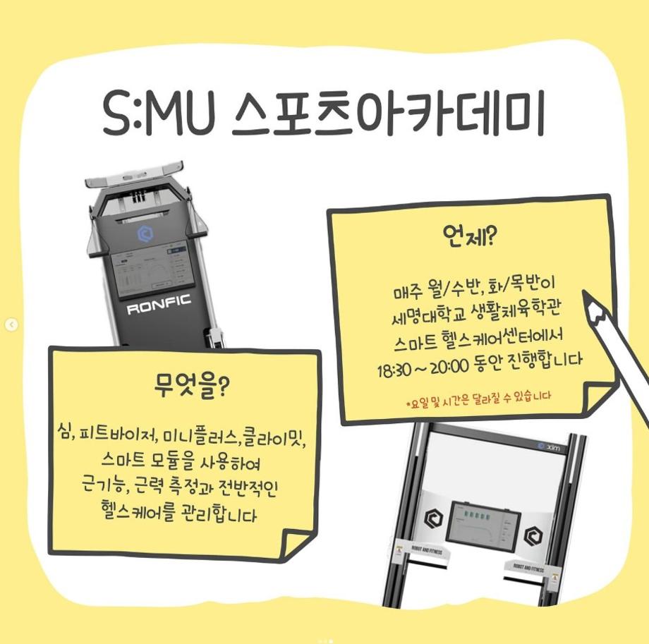 본문 시작 홈으로 커뮤니티SNS 학과소개 진로취업사례 입학안내 교육과정 커뮤니티SNS 홈페이지가이드 학과행사갤러리 학과공지 열린정보SNS 학과동아리 학과행사갤러리 학과MOU 학생회조직도 학과연혁 동문회조직도 학과행사갤러리 페이스북 트위터 프린트 S:MU 스포츠아카데미 AI 피트니스 소개 생활체육학과 2105 2025-07-31 S:MU 스포츠아카데미 AI 피트니스를 소개합니다👏🏻 AI 피트니스 장비를 통해 근력 향상뿐만 아니라 골프, 축구, 야구 등 다양한 스포츠 종목에서 접목시킬 수 있으니 관심 있는 학우분들은 참고 부탁드립니다⛳️⚽️⚾️ 더 자세한 내용이 궁금하시다면 학교 홈페이지를 방문해 주시길 바랍니다😊 목록 이전생활체육학과 제30대 학회장 선거 다음 전국 파라미타 청소년연합회 학과체험 담당부서 : 생활체육학과 담당자 : - 연락처 : 043-469-1289 최종수정일 : 2024-10-26 만족도조사 만족도 조사 이 페이지에서 제공하는 정보에 대하여 만족하시나요? 매우만족 만족 보통 불만족 매우불만족