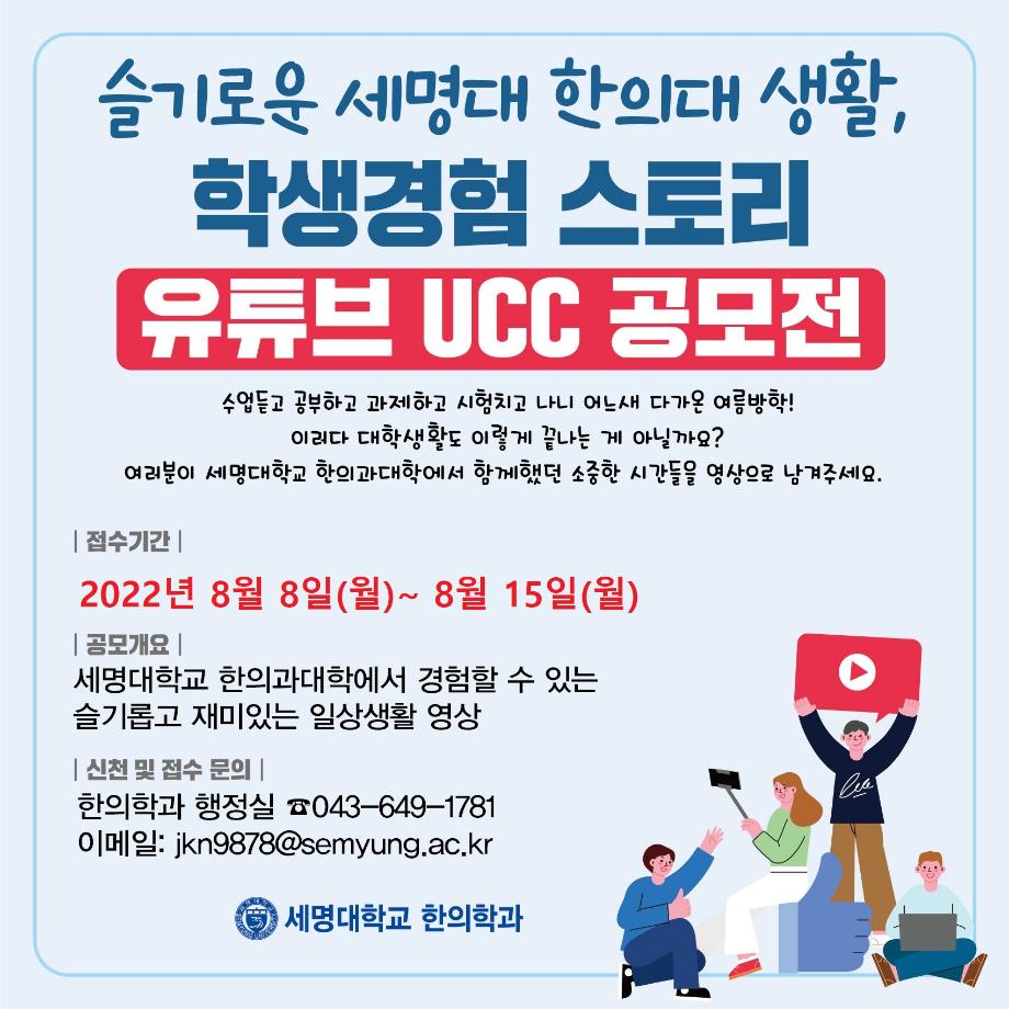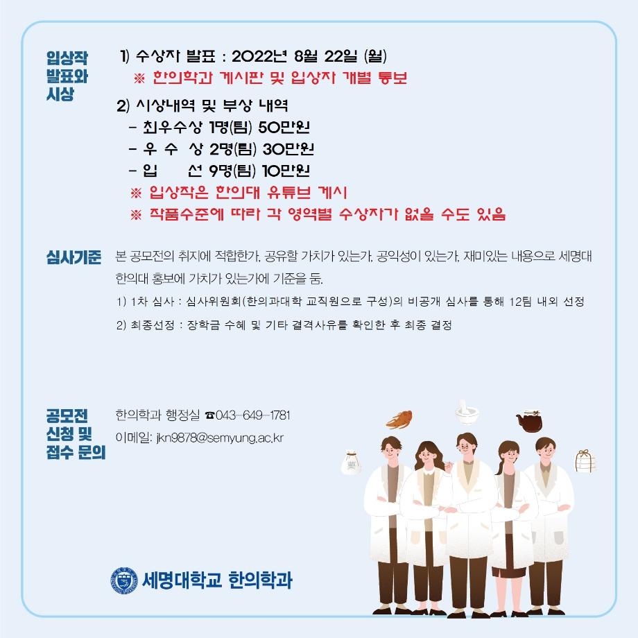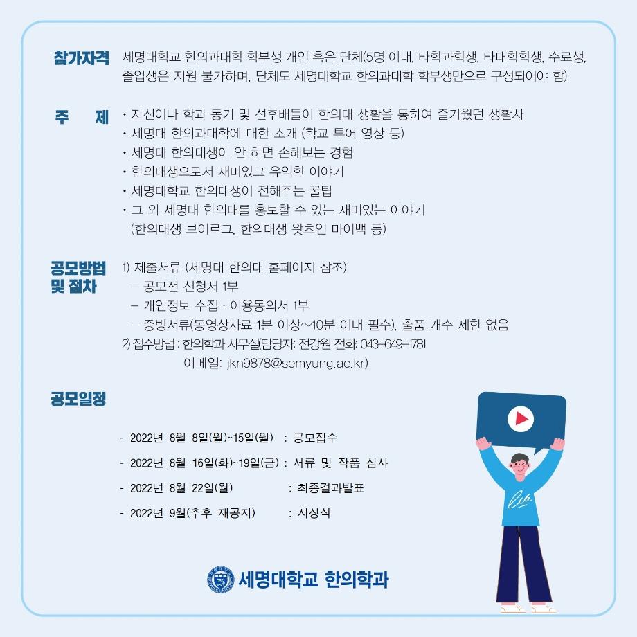 본문 시작 홈으로 대학소식 대학소개 교수소개 대학과정 커뮤니티 대학원 대학소식 홈페이지가이드 포토갤러리 학과공지 포토갤러리 발전기금 위원회 관련사이트 포토갤러리 페이스북 트위터 프린트 슬기로운 한의대 생활 학생경험 스토리 유튜브 UCC 공모전 한의과대학 3066 2022-07-01 슬기로운 한의대 생활 학생경험 스토리 유튜브 UCC 공모전 접수기간 : 2022.08.08(월) ~ 2022.08.15(월) 신청 및 접수 : 한의학과 행정실 (043-649-1781) 이메일 주소 : jkn9878@semyung.ac.kr 목록 이전[중등교육 연계프로그램] 충주 대원고등학교 특강 다음 <2022년 7월 1일자 한의과대학 보직 임명사항 안내> 담당부서 : 한의과대학 담당자 : - 연락처 : 043-649-1701 최종수정일 : 2024-10-26 만족도조사 만족도 조사 이 페이지에서 제공하는 정보에 대하여 만족하시나요? 매우만족 만족 보통 불만족 매우불만족