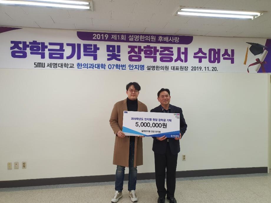 설명한의원 대표 안지명 원장은 세명대학교 한의과대학에 장학금 500만원을 기탁하고, 김태훈,박수진,원지현 학생에게 장학증서와 함께 장학금 100만원씩을 각각 전달했다.