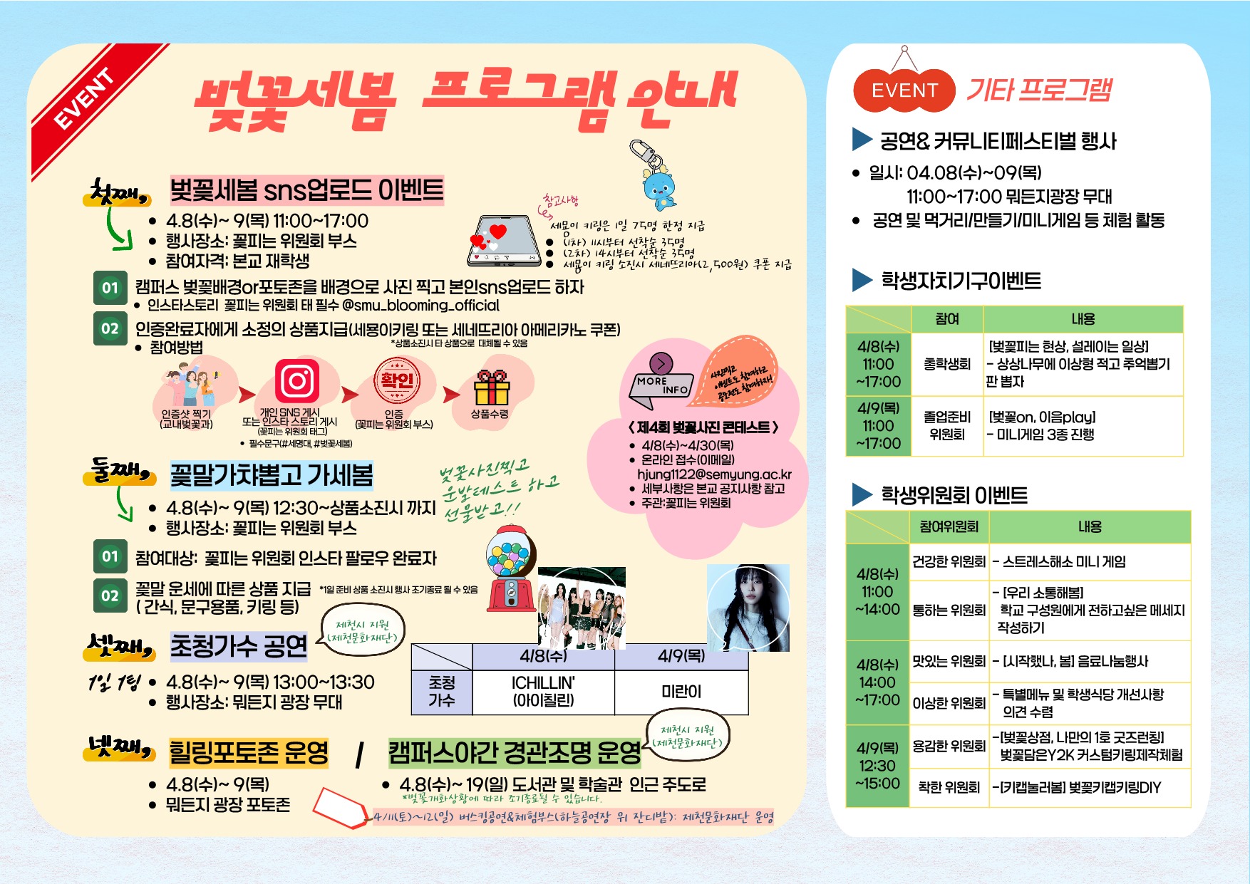 본문 시작 홈으로 커뮤니티 대학소개 학과소개 입학안내 커뮤니티 홈페이지가이드 대학소식 대학소식 학과소식 자료실 대학소식 페이스북 트위터 프린트 제5회 세명대학교 벚꽃축제 '벚꽃세봄' 개최 안내 보건바이오대학 조회 : 3 등록일 : 2026-04-03 2-1. 벚꽃세봄_포스터_1.jpeg ( 1,523 kb) ?atchFileId=FILE_000000000237366&fileSn=0 2-1. 벚꽃세봄_포스터_1.jpeg 2-2. 벚꽃세봄_리플렛_1.jpeg ( 601 kb) ?atchFileId=FILE_000000000237366&fileSn=1 2-2. 벚꽃세봄_리플렛_1.jpeg 2-2. 벚꽃세봄_리플렛_2.jpeg ( 595 kb) ?atchFileId=FILE_000000000237366&fileSn=2 2-2. 벚꽃세봄_리플렛_2.jpeg 목록 이전2026학년도 보건바이오대학 인문 특강[2주차] 다음 제11회 커뮤니티 페스티벌 안내 만족도조사 만족도 조사 이 페이지에서 제공하는 정보에 대하여 만족하시나요? 매우만족 만족 보통 불만족 매우불만족