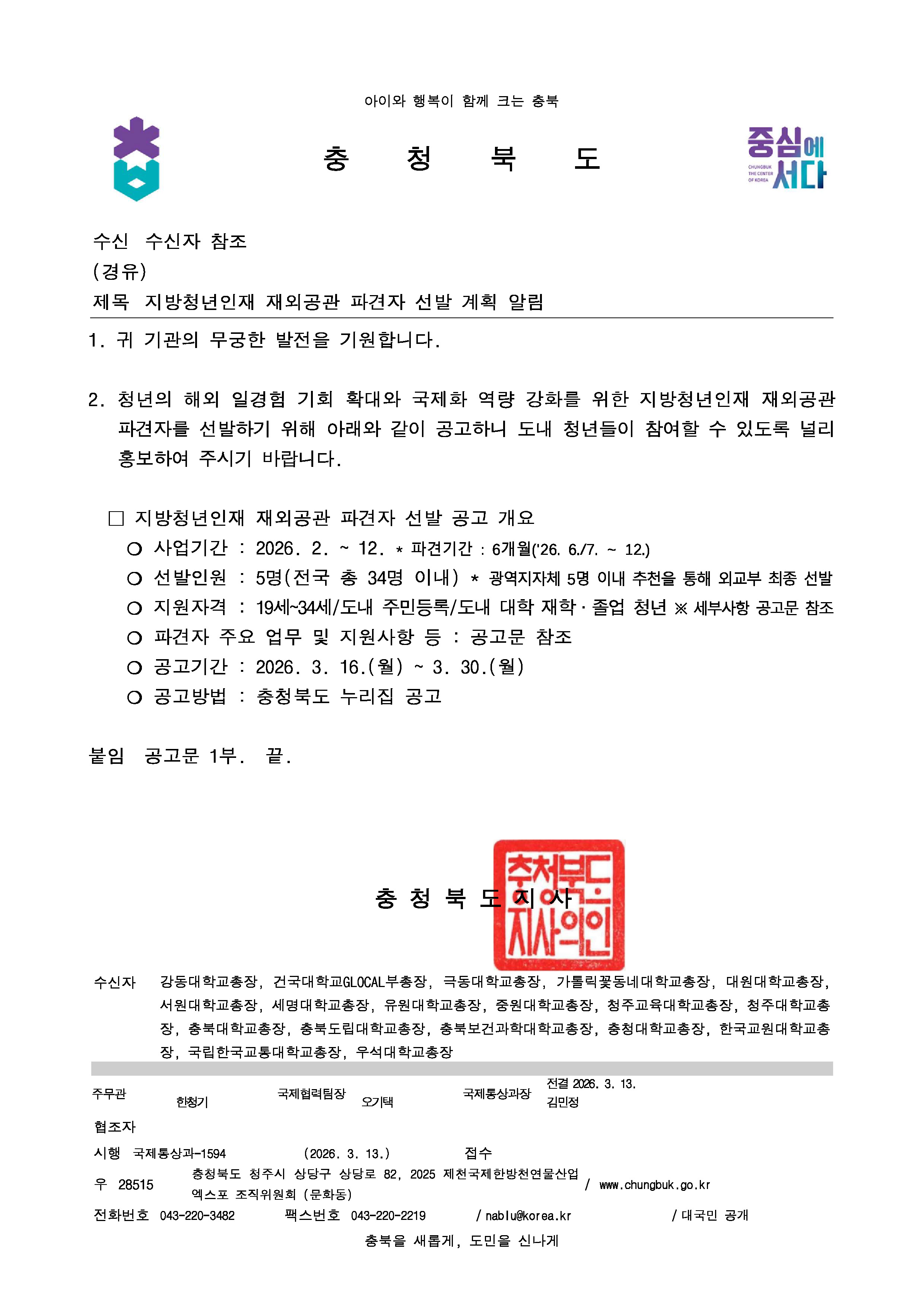본문 시작 홈으로 커뮤니티 대학소개 학과소개 입학안내 커뮤니티 홈페이지가이드 자료실 대학소식 학과소식 자료실 자료실 페이스북 트위터 프린트 [충청북도] 지방청년인재 재외공관 파견자 선발 계획 알림 보건바이오대학 조회 : 72 등록일 : 2026-03-13 공고문.hwp ( 96 kb) ?atchFileId=FILE_000000000236581&fileSn=0 공고문.hwp 목록 이전국가자격동향지(Q-letter) 2026년 3월호 다음 [한국산업인력공단] 2026년 해외 일경험 온라인 설명회 홍보 협조 요청 담당부서 : 보건바이오대학 담당자 : - 연락처 : 043-649-7432 최종수정일 : 2024-10-26 만족도조사 만족도 조사 이 페이지에서 제공하는 정보에 대하여 만족하시나요? 매우만족 만족 보통 불만족 매우불만족