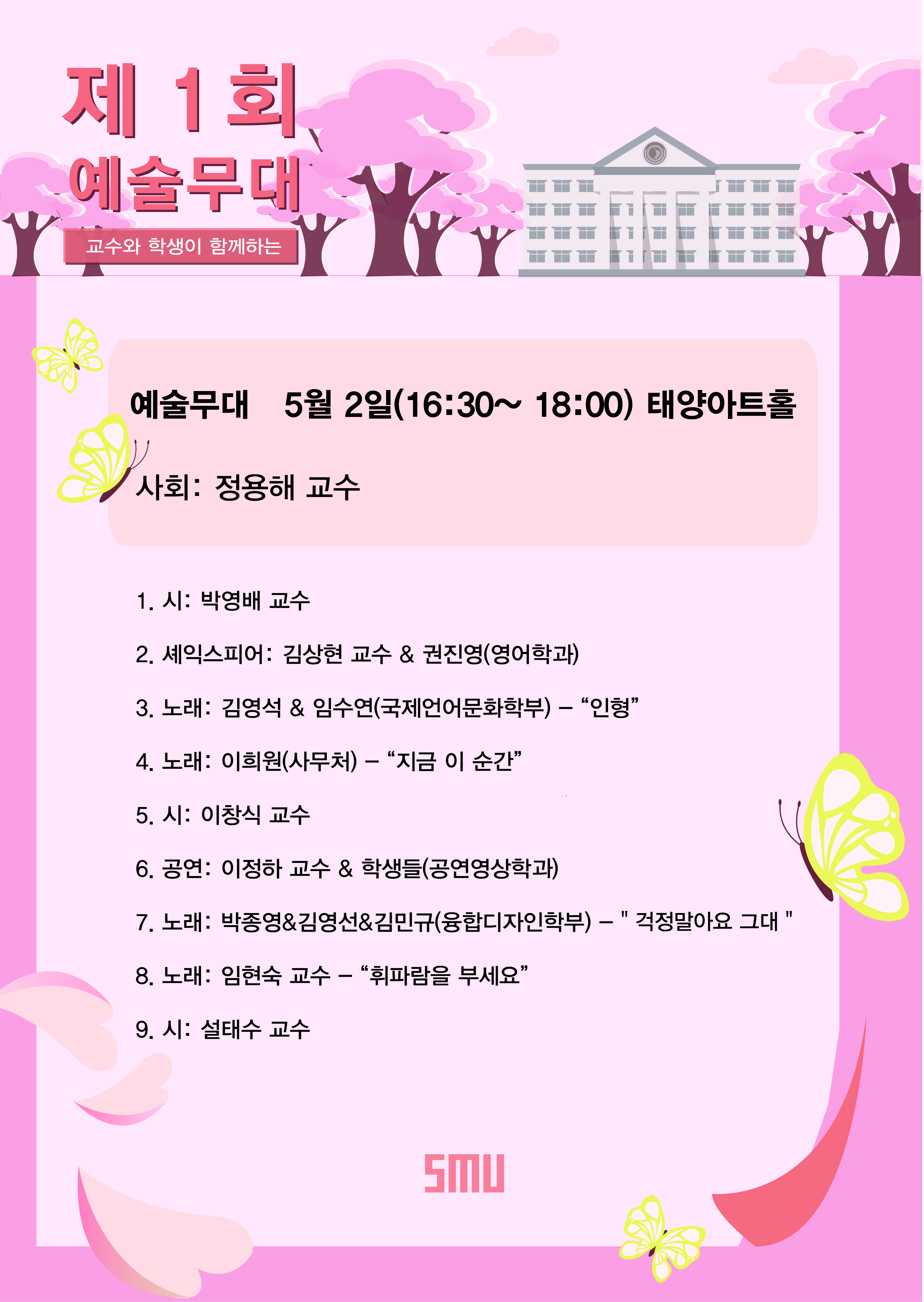 본문 시작 홈으로 커뮤니티 대학소개 학과소개 입학안내 커뮤니티 홈페이지가이드 사진 자료실 대학소식 학과소식 자료실 사진 자료실 동영상 자료실 사진 자료실 페이스북 트위터 프린트 제1회 교수와 학생이 함께하는 예술무대 인문예술대학 7067 2018-04-27 제1회 교수와 학생이 함께하는 예술무대 날짜 : 2018학년 5월 2일 수요일 장소 : 공학관 5층 태양아트홀 시간 : 16:30~18:00 목록 이전[융합디자인학부] 시각디자인 전공 신희경 교수 일본 닛본대학 지원 갤러리에서 전시회 개최 다음 제1회 교수와 학생이 함께하는 예술무대 사진 담당부서 : 인문예술대학 담당자 : - 연락처 : 043-649-7402 최종수정일 : 2024-10-26 만족도조사 만족도 조사 이 페이지에서 제공하는 정보에 대하여 만족하시나요? 매우만족 만족 보통 불만족 매우불만족