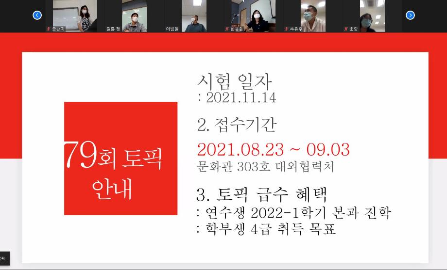 본문 시작 2021-여름 한국어연수생 종강식 국제교육원 2307 2021-08-13 2021-여름 한국어연수생 종강식 코로나19로 인해 비대면 종강식을 실시하였습니다. 목록 이전2021-여름 생활적응지원프로그램 다음 2021-가을학기 신입생 오리엔테이션 담당부서 : 국제교육원 담당자 : - 연락처 : 043-649-1185 최종수정일 : 2024-10-26 만족도조사 만족도 조사 이 페이지에서 제공하는 정보에 대하여 만족하시나요? 매우만족 만족 보통 불만족 매우불만족