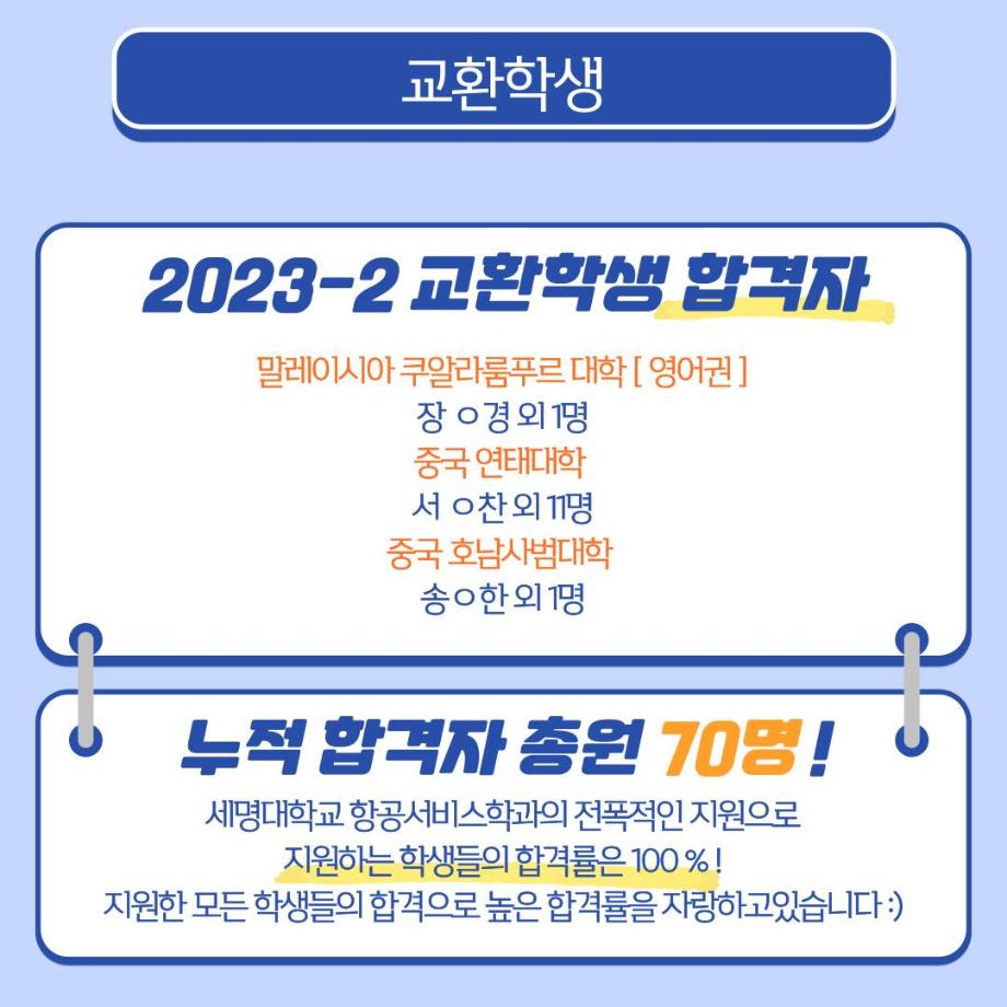 저희 세명대학교는 일본,중국,말레이시아,체코 등 다양한 학교로 교환학생을 신청할 수 있으면 합격률 1️⃣0️⃣0️⃣퍼센트를 보장하고 있습니다 !