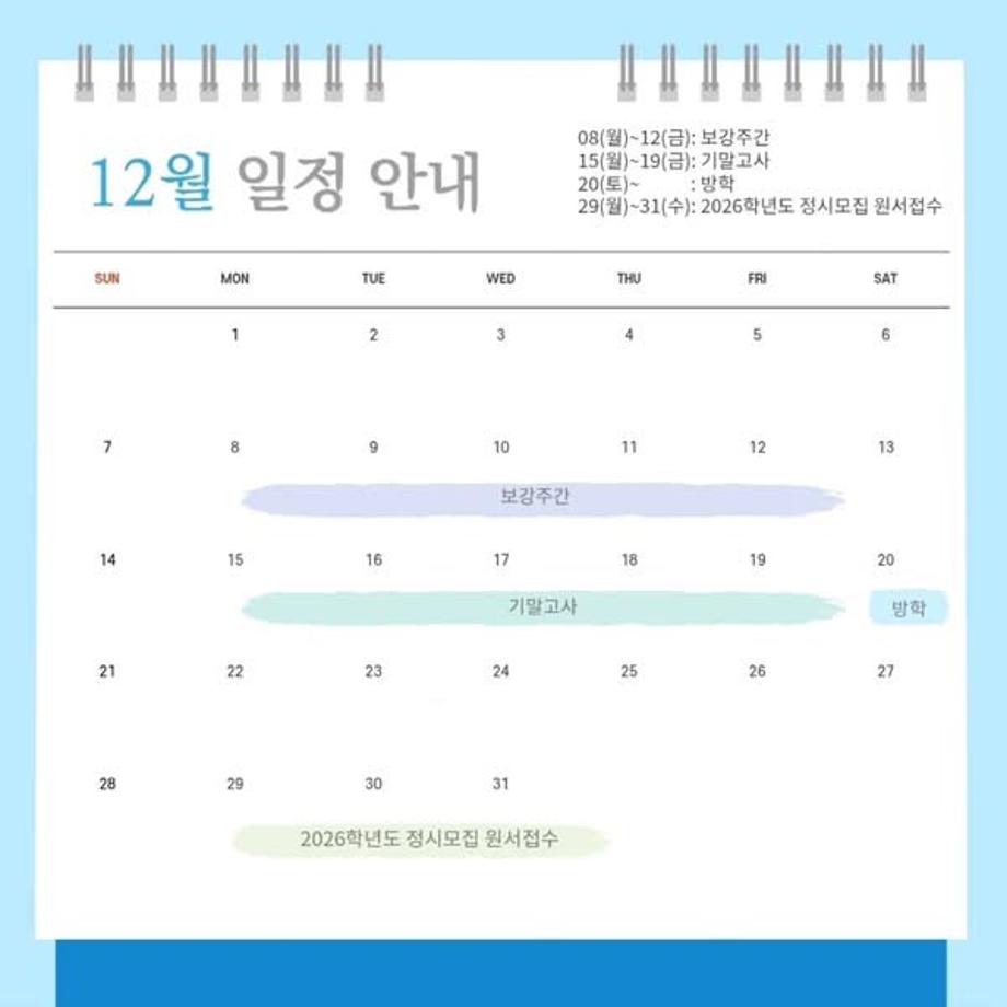 본문 시작 홈으로 커뮤니티 학과소개 입학정보 교과과정 커뮤니티 홈페이지가이드 포토갤러리 SNS 소통 공간 포토갤러리 공지사항 동아리 포토갤러리 페이스북 트위터 프린트 12월 다이어리 항공서비스학과 3002 2025-12-02 안녕하십니까 세명대학교 항공서비스학과 온라인 홍보국 💙푸르미르💙입니다. 12월에는 기말고사와 2026학년도 정시모집 원서접수가 있습니다! 확인하시고 일정에 착오 없으시길 바라겠습니다 😊 소중한 꿈을 품고 그 누구보다 높이 오를 여러분을 저희 "푸르미르" 가 항상 응원하겠습니다 ✈💙 궁금한 사항이 있으시다면 언제든지 SNS로 연락 주십시오 💬 #세명대학교 #항공서비스학과 #세명대 목록 이전세명대학교 편의시설 안내 다음 말레이시아 비자 발급