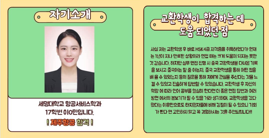 세명대학교 항공서비스학과 17학번 이ㅇ민, 19학번 김ㅇ연 선배님들께서 직접 답해주신 항공사 최종합격의 비밀들과 꿀팁을 담아보았습니다 📝