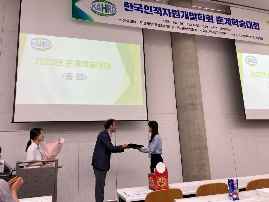 한국인적자원개발학회(회장 문재승)에서 개최한 “2023 한국인적자원개발학회 춘계학술대회”에서 충북대학교 김학수 교수님과 세명대학교 항공서비스학과 조민경 교수님이 '조직냉소주의의 효과와 임파워링 리더십의 상황적 조건' 논문을 발표해 '한국인적자원개발학회 우수논문 발표상'을 수상했습니다 🏆