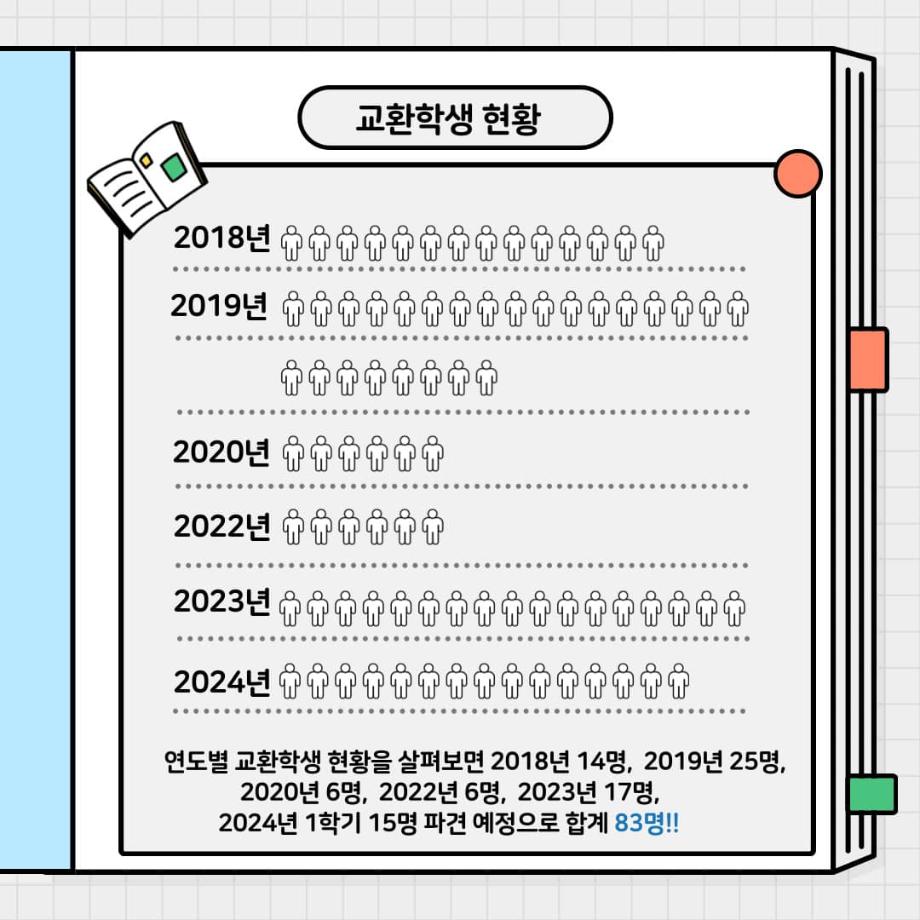 🌎교환학생 프로그램은 한 학기 또는 1년 동안 외국의 자매 대학교에서 수업을 수강하며 그 나라의 문화 및 교육을 체험하는 프로그램으로 학교 전체가 아닌 단일학과에서 위와 같은 인원을 파견하는 것은 전무후무한 놀라운 성과입니다.👏