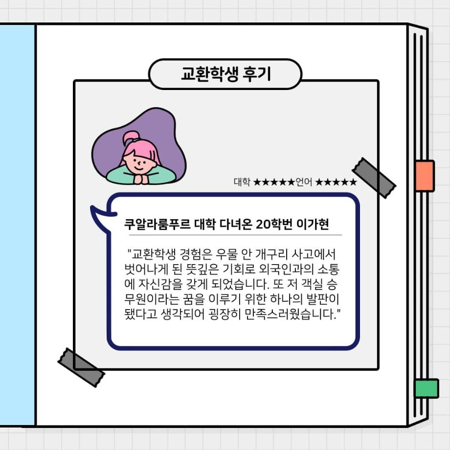2023년 1학기 말레이시아 🙌쿠알라룸푸르대학에 다녀온 20학번 이가현 학생은 ”교환학생 경험은 우물 안 개구리 사고에서 벗어나게 된 뜻깊은 기회로 외국인과의 소통에 자신감을 갖게 됐다“며 ”객실 승무원이라는 꿈을 이루기 위한 하나의 발판이 됐다“고 전했습니다.
