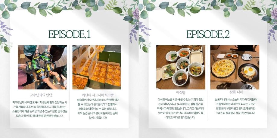 근무 중에는 학과장님의 깜짝 방문과 함께 따뜻한 격려의 말씀과 응원을 해주셨습니다!! 또 정직원으로 계시는 1,2기 선배님들의 챙김 덕분에 수월하게 실습을 마칠 수 있었습니다