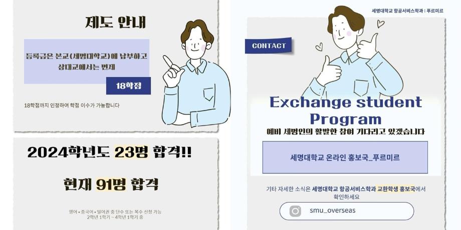 세명대학교 항공서비스학과는 교환학생 합격률 1️⃣0️⃣0️⃣%를 자랑하고 있으며 희망하는 학생들은 해당 자격만 갖추어진다면 모두 가실 수 있습니다!!