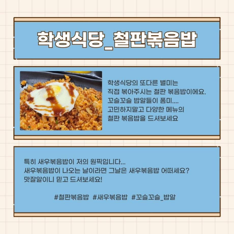 세명대학교 학생식당👩🍳🧑🍳은 학생들의 건강과 만족을 최우선으로 생각하는 공간입니다. 다양한 메뉴🍜와 합리적인 가격💰으로, 매일 바쁜 학업 중에서도 맛있고 든든한 식사를 제공해 주십니다. 세명대학교 학생식당은 맛있고 건강한 한 끼를 제공하며, 학생들의 지친 학업📚에 삶의 활력💪을 더해주는 소중한 공간입니다. 언제든지 방문하여 맛있는 음식을 즐겨보세요!😁