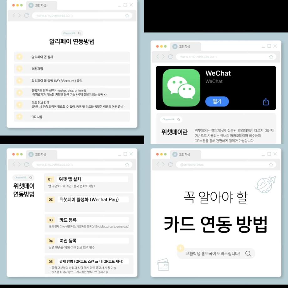 본문 시작 홈으로 커뮤니티 학과소개 입학정보 교과과정 커뮤니티 홈페이지가이드 포토갤러리 SNS 소통 공간 포토갤러리 공지사항 동아리 포토갤러리 페이스북 트위터 프린트 중국 카드 연동 방법 항공서비스학과 4342 2025-05-05 안녕하십니까 세명대학교 항공서비스학과 온라인 홍보국 💙푸르미르💙입니다. 오늘은 중국 교환학생에서 꼭 필요한 카드연동 방법 카드뉴스를 가져와보았습니다 😊 많은 도움이 되길 바랍니다!! 소중한 꿈을 품고 그 누구보다 높이 오를 여러분을 저희 "푸르미르" 가 항상 응원하겠습니다 ✈💙 궁금한 사항이 있으시다면 언제든지 SNS로 연락 주십시오 💬 #세명대학교 #항공서비스학과 #세명대 #항공과 #푸르미르 #카드연동 #카드 #중국 #교환학생 목록 이전5월 다이어리 다음 김포공항 국립박물관 견학