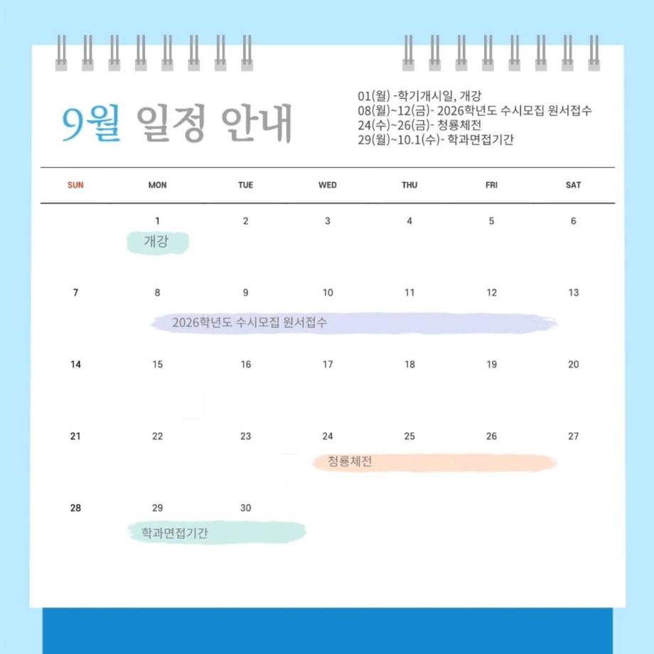 본문 시작 홈으로 커뮤니티 학과소개 입학정보 교과과정 커뮤니티 홈페이지가이드 포토갤러리 SNS 소통 공간 포토갤러리 공지사항 동아리 포토갤러리 페이스북 트위터 프린트 9월 다이어리 항공서비스학과 3882 2025-09-01 안녕하십니까 세명대학교 항공서비스학과 온라인 홍보국 💙푸르미르💙입니다. 오늘은 9월 다이어리를 가져와보았습니다 😄 9월에는 개강과 청룡체전이 있습니다! 모두 일정에 착오 없으시길 바라겠습니다! 소중한 꿈을 품고 그 누구보다 높이 오를 여러분을 저희 "푸르미르" 가 항상 응원하겠습니다 ✈💙 궁금한 사항이 있으시다면 언제든지 SNS로 연락 주십시오 💬 #세명대학교 #항공서비스학과 #세명대 #항공과 #푸르미르 #9월 #다이어리 목록 이전💙에어프레미아항공 객실승무원 취업💙 이전교환학생 준비 브이로그