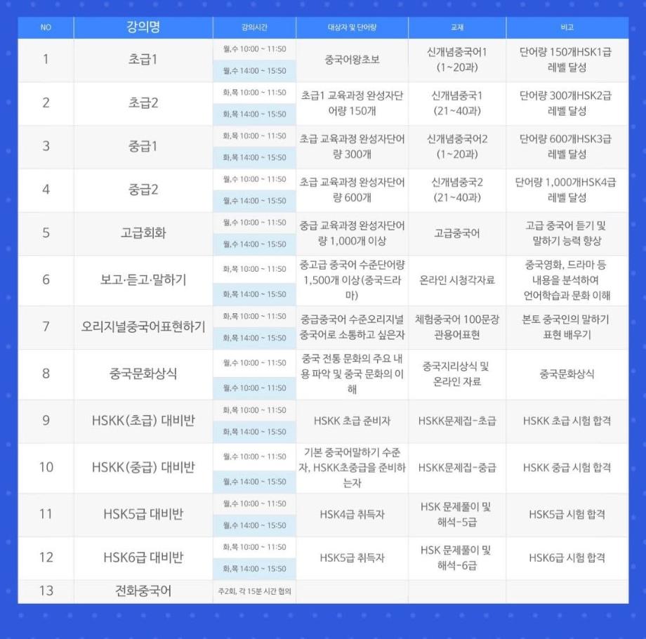 세명대학교 공자학원에서 중국어 학습을 희망하는 분들을 위해 초급부터 고급 과정, 회화 수업, HSK·HSKK 대비반 등 다양한 중국어 강좌를 운영하고 있습니다.