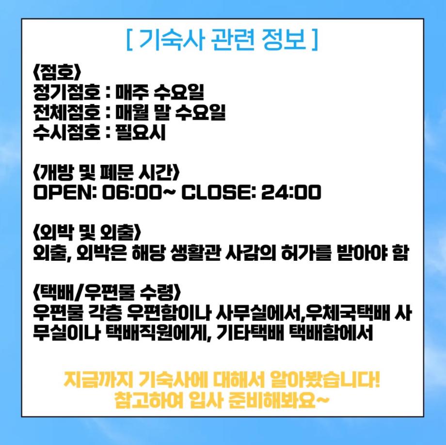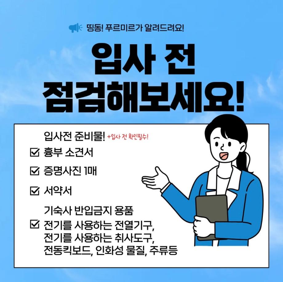 본문 시작 홈으로 커뮤니티 학과소개 입학정보 교과과정 커뮤니티 홈페이지가이드 포토갤러리 SNS 소통 공간 포토갤러리 공지사항 동아리 포토갤러리 페이스북 트위터 프린트 기숙사 체크리스트 항공서비스학과 329 2026-03-25 안녕하십니까 세명대학교 항공서비스학과 온라인 홍보국 푸르미르 입니다 오늘은 세명대학교 기숙사 입사를 앞둔 학생들을 위해 입사 전 반드시 확인해야 할 사항을 안내드립니다 입사 일정 및 세부 유의사항을 사전에 확인하여 입사에 차질이 없도록 준비해주시기 바랍니다 소중한 꿈을 품고 그 누구보다 높이 오를 여러분들을 저희 "푸르미르"가 항상 응원하겠습니다 궁금한 사항이 있으시다면 언제든지 SNS로 연락 주십시오 목록 이전2월 다이어리 다음 말레이시아 추천 맛집