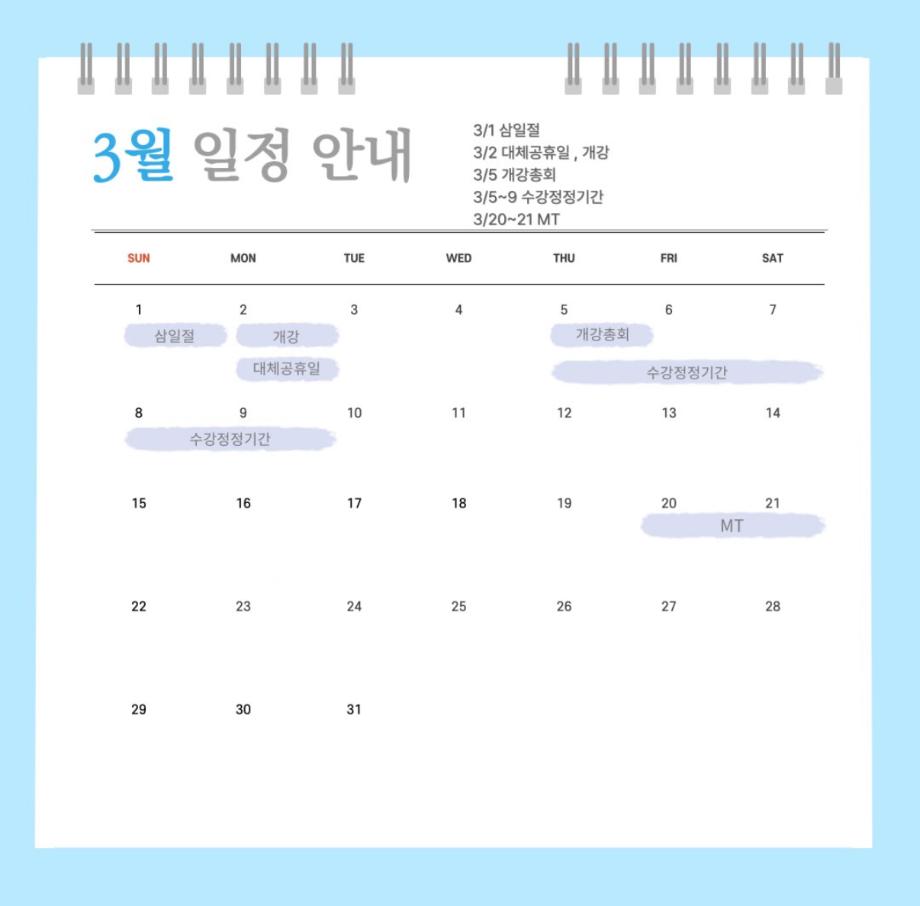 본문 시작 홈으로 커뮤니티 학과소개 입학정보 교과과정 커뮤니티 홈페이지가이드 포토갤러리 SNS 소통 공간 포토갤러리 공지사항 동아리 포토갤러리 페이스북 트위터 프린트 3월 다이어리 항공서비스학과 330 2026-03-25 안녕하십니까 세명대학교 항공서비스학과 온라인 홍보국 푸르미르 입니다 오늘은 3월 다이어리를 가져왔습니다! 3월에는 삼일절과 개강, 개강총회 그리고 수강정정기간 및 MT가 예정되어 있습니다 확인하시고 일정에 착오 없으시길 바라겠습니다! 소중한 꿈을 품고 그 누구보다 높이 오를 여러분들을 저희 "푸르미르"가 항상 응원하겠습니다 궁금한 사항이 있으시다면 언제든지 SNS로 연락 주십시오 목록 이전말레이시아 추천 맛집 다음 세명대학교 장학금제도