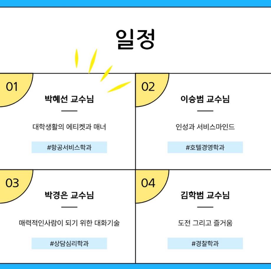 첫째 주에는 박혜선 교수님의 ‘에티켓과 매너‘, 이승범 교수님의 ‘인성과 서비스 마인드‘ 강의가 이루어졌으며, 둘째 주에는 김학범 교수님의 ’도전 그리고 즐거움‘, 김성은 교수님의 ’MBTI는 과학인가?’를 주제로 한 강의가 진행되었습니다🤍
