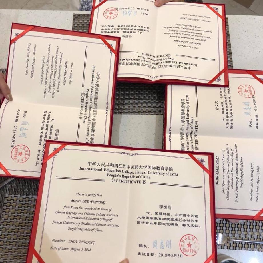 오후에는 과복을 입고 강서중의약대학에서 입교식을 했습니다. 강서중의약대학 총장님을 비롯해 모든 관계자 분들은 환한 미소와 함께 저희를 크게 환영해 주시고 만찬도 준비해주셨습니다. 각종 중국음식들을 먹고 다같이 파이팅을 외치며 하루가 성공적으로 마무리 되었습니다.