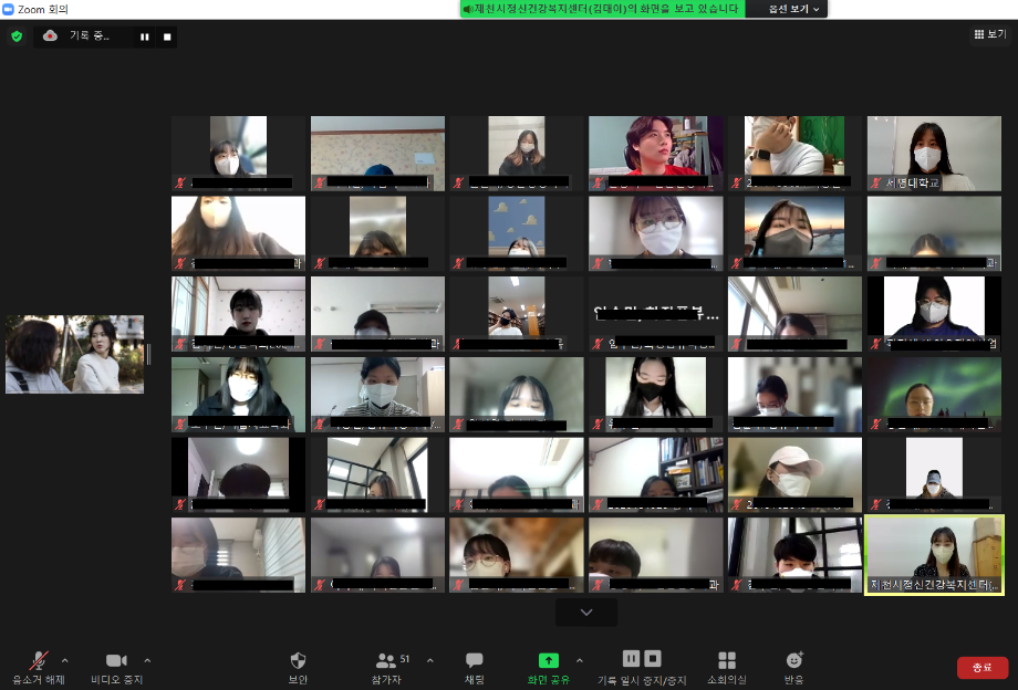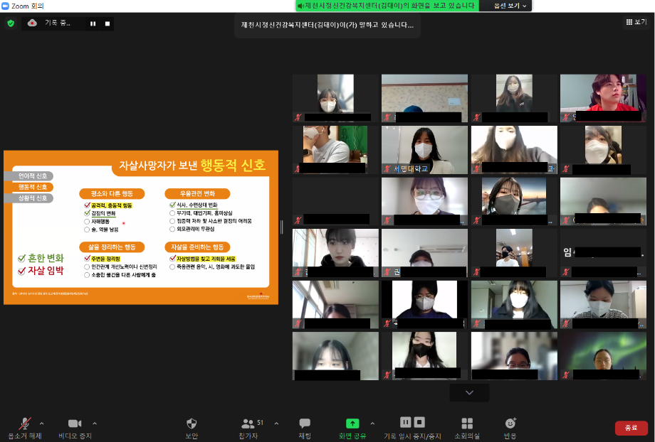 본문 시작 2022학년도 건강상담의 날 "자살예방교육"(03.24) CHARM케어상담센터 4025 2022-03-25 2022학년도 1학기 첫번째 건강상담의 날 "자살예방교육"(2022.03.24) 목록 이전12월 불법카메라 정기점검 진행 다음 2022학년도 1학기 청년 대상 "방방곡곡" 마음안심버스 운영 담당부서 : CHARM케어상담센터 담당자 : - 연락처 : 043-649-1789 최종수정일 : 2024-10-26 만족도조사 만족도 조사 이 페이지에서 제공하는 정보에 대하여 만족하시나요? 매우만족 만족 보통 불만족 매우불만족