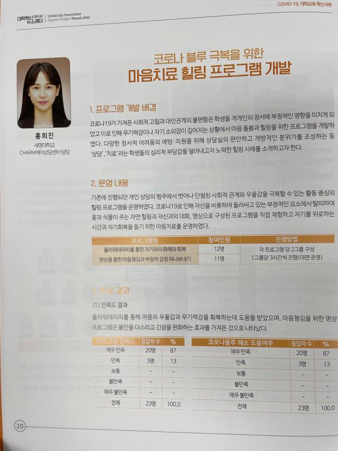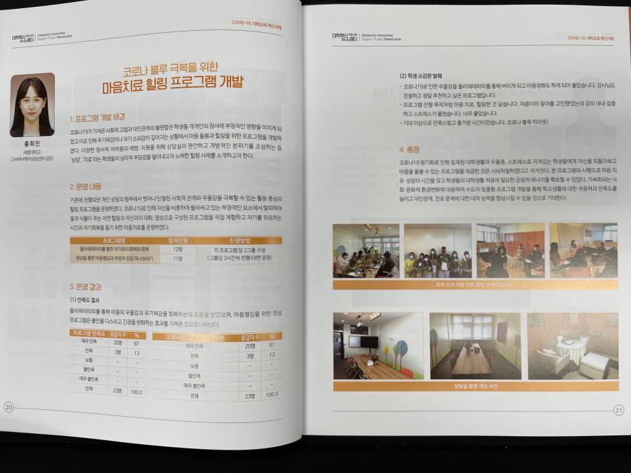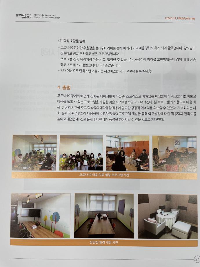 본문 시작 2021학년도 대학혁신지원사업 뉴스레터 6호 소식지 <코로나-19 마음치료 힐링 프로그램> 기재 CHARM케어상담센터 3438 2021-08-24 2021학년도 대학혁신지원사업 뉴스레터 6호 소식지에 <코로나-19 마음치료 힐링 프로그램>이 우수 프로그램으로 기재되었습니다. 목록 이전인권서포터즈 노인학대예방의날 캠페인 다음 인권서포터즈 사회복지의날 캠페인 진행 담당부서 : CHARM케어상담센터 담당자 : - 연락처 : 043-649-1789 최종수정일 : 2024-10-26 만족도조사 만족도 조사 이 페이지에서 제공하는 정보에 대하여 만족하시나요? 매우만족 만족 보통 불만족 매우불만족
