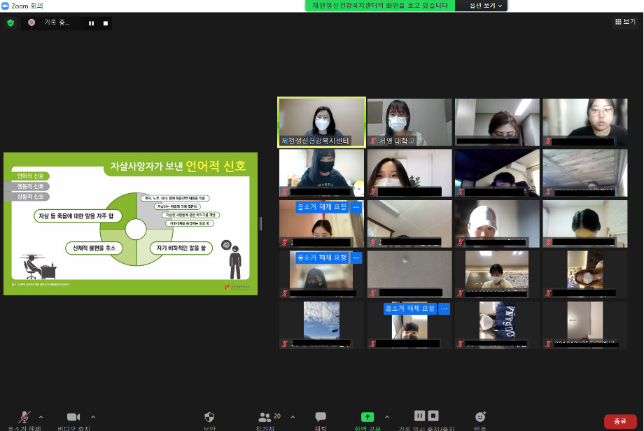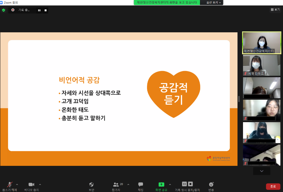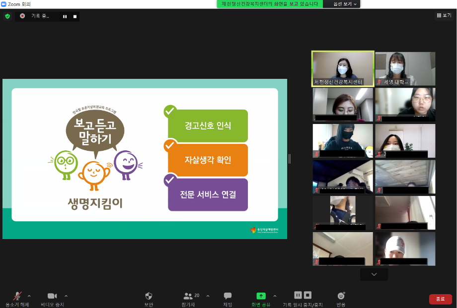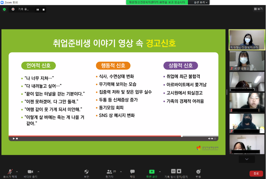 본문 시작 2021학년도 건강상담의 날 "자살예방교육"(10.26) 실시 CHARM케어상담센터 3588 2021-10-26 <건강상담의 날 "자살예방교육" 실시> 일시 : 10/26(화) 14:00~15:00 강사 : 제천시정신건강복지센터 팀장 신효진 목록 이전인권서포터즈 사회복지의날 캠페인 진행 다음 교내 폭력예방 캠페인 진행 담당부서 : CHARM케어상담센터 담당자 : - 연락처 : 043-649-1789 최종수정일 : 2024-10-26 만족도조사 만족도 조사 이 페이지에서 제공하는 정보에 대하여 만족하시나요? 매우만족 만족 보통 불만족 매우불만족