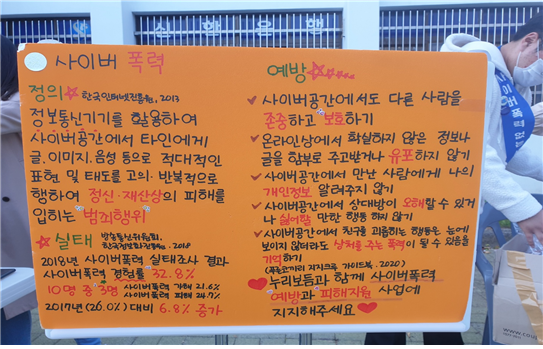 본문 시작 2020학년도 사이버폭력 예방 캠페인 CHARM케어상담센터 4440 2020-10-28 사회복지학과 학생들과 함께 목록 이전2020 상호 교류 협력을 위한 협약식 다음 2020학년도 불법카메라 10월 정기 점검 담당부서 : CHARM케어상담센터 담당자 : - 연락처 : 043-649-1789 최종수정일 : 2024-10-26 만족도조사 만족도 조사 이 페이지에서 제공하는 정보에 대하여 만족하시나요? 매우만족 만족 보통 불만족 매우불만족