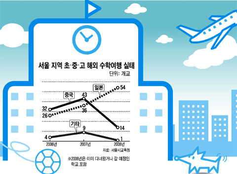 서울시내 초·중·고 해외 수학여행 실태를 보면, 2006년 62개교, 2007년 88개교가 해외로 수학여행을 다녀온 것에 비해 올해는 69개교만 이미 다녀왔거나, 갈 예정이다. 특히 고교의 경우 올해는 지난해 65개에 비해 22곳이나 줄어든 43개교만 해외 수학여행을 가겠다고 시교육청에 보고했다.